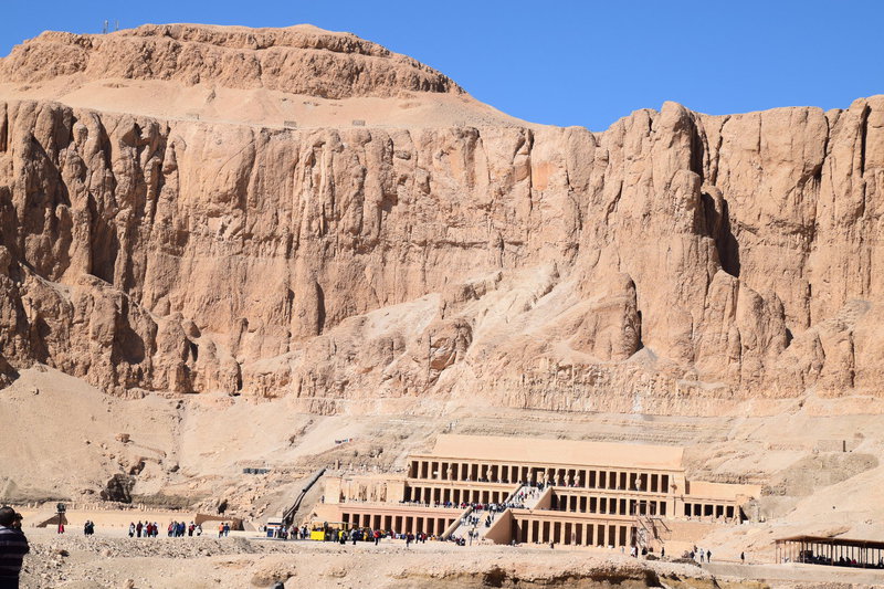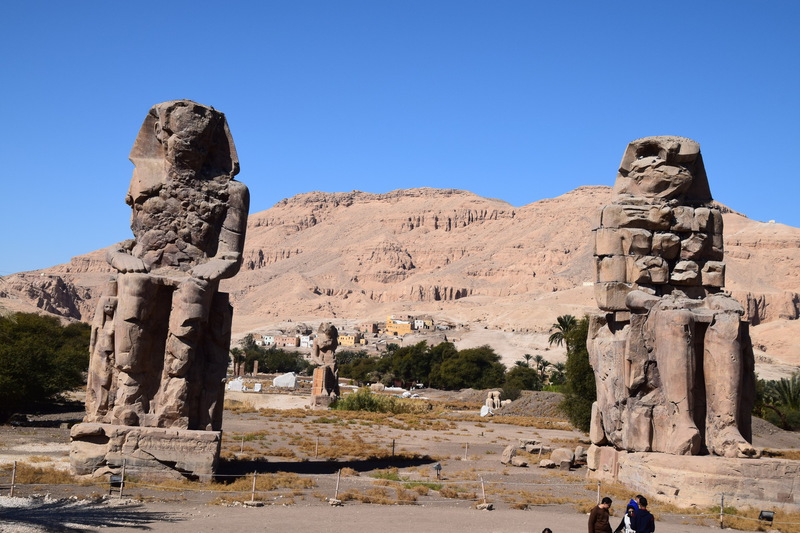 Nach kurzer Weiterfahrt gelangen wir zum Totentempel der Hatschepsut. Sie war eine der wenigen Frauen, die über als Königin über Ägypten regierte. Wir beschließen unseren Ausflug an das Westufer des Nils, mit den gewaltigen Memnonkolossen. Die als beinahe einziges Relikt des riesigen Tempels Amenophis III. , schon im Altertum höchste Bekanntheit genossen hat.