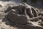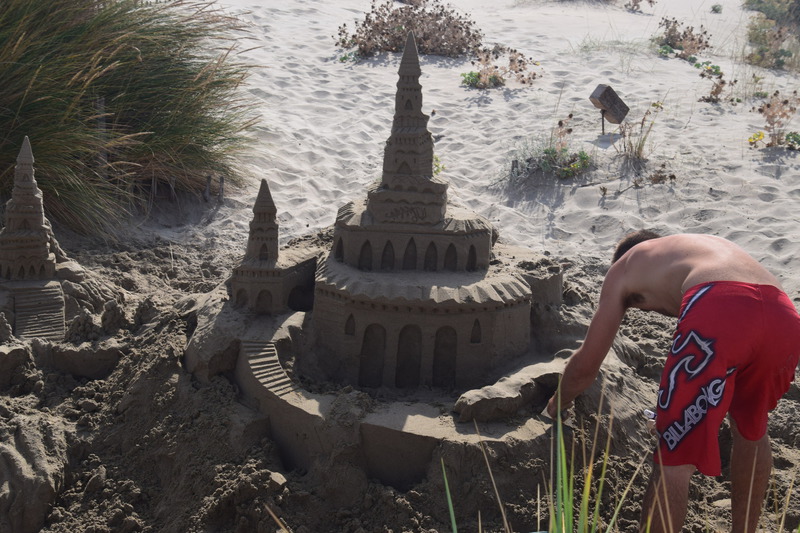 Ps.: Der Strand ist, mit einem Tau von der Straße, die ebenfalls voller Sand ist, abgetrennt. Als wir vom Baden zurück gehen, spricht Mario einen Mann, der ebenfalls auf unserem Platz steht und mit 2 Gläsern Rotwein zum Strand geht, an. Er achtet zu wenig auf das Tau und bleibt mit dem Schuh/Fuß hängen und fällt darüber hinweg – rums machts und da liegt er – hat sich gottseidank nur ein wenig die Haut am Unterarm aufgeschürft.