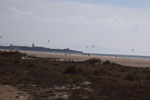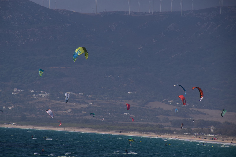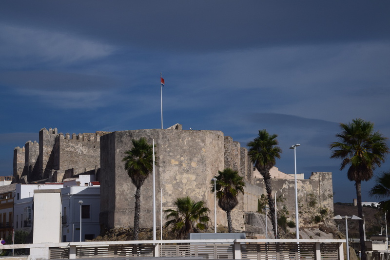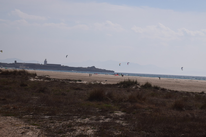 Nach knapp 50 Kilometern, die wir auf einen Rutsch fahren ?, kommen wir in Tarifa an. Wir finden auf Anhieb einen Platz am Strand und ,übernachten heute zum ersten Mal auf unserer Reise am Atlantik. Nach der Erkundung unseres näheren Umfeldes machen wir uns auf den Weg in die Stadt, immer am Strand entlang. Wir kommen zur vorgelagerten „Isla de Tarifa“, dem geographischen Übergang von Atlantik zum Mittelmeer. Von hier aus sind es gerade mal 14 Kilometer nach Afrika. Vorbei am Hafengelände kommen wir zum gut erhaltenen Castillo de Tarifa (leider schon geschlossen). Am Eingang des Castillos befindet sich eine Statue, die König Sancho IV. und einem Löwen, nachempfunden ist. Wir wandern entlang der Stadtmauer und kommen durch viele kleine Gassen mit Cafés, Bars und kleinen Geschäften. Unsere Wanderung dauert über 3 ½ Stunden. An der Atlantikküste hat der Wind aufgefrischt und es sind unzählige Kite-Surfer auf dem Wasser – es bietet sich ein wirres Bild von Kite-Schirmen.