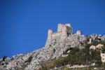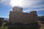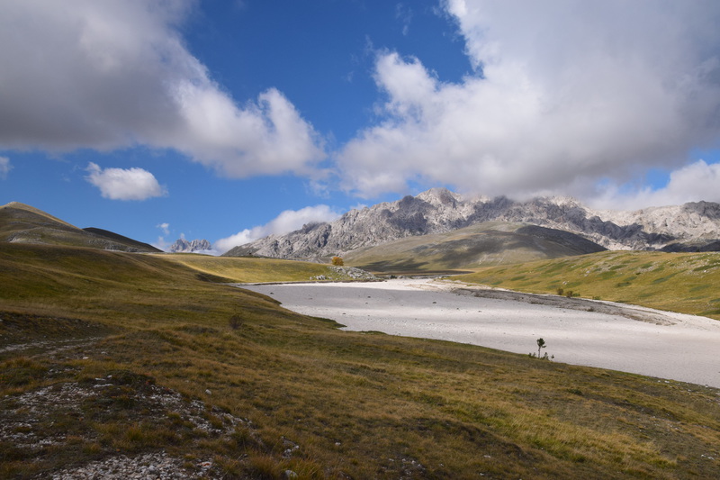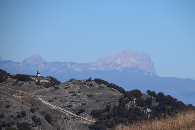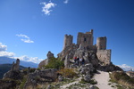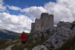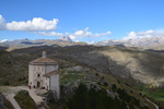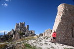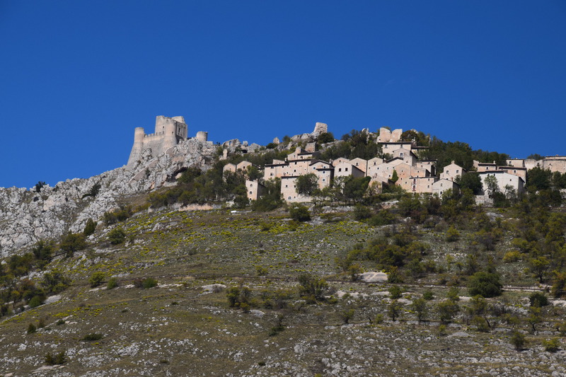 Wir verlassen die Küste wieder um noch einmal in die Berge des Gran Sasso zu fahren, die Wetterprognosen sind gut. Diesmal fahren wir nicht auf der Autobahn sondern auf der Landstraße um auf schöner Strecke in den Nationalpark zu gelangen. Auf unserem Weg entdecken wir plötzlich auf einem Bergrücken eine Burg mit einem darunterliegenden Dorf und beschließen von unserem eigentlichen Weg abzufahren. Der Ort heiß Calascio und hat gerade mal noch ca. 130 Einwohner – wir parken unterhalb und beginnen unsere Wanderung zur Rocca di Calascio, die auf einem schroffen Felsrücken in 1460 m Höhe thront. Vier gemauerte Rundtürme stemmen sich gegen einen ummauerten, engen Burgfried, in dessen Mitte sich die massige Ruine eines Wehrturms erhebt. Etwas unterhalb der Burg befindet sich auf einem Felsrücken die kleine Kirche Santa Maria della Pietà. Im halbverfallenen Borgo Calascio das wahrscheinlich nach dem Erdbeben 1703 aufgegeben wurde, kehrt heute wieder Leben ein. Es befinden sich einige kleine Souvenirläden hier und das Rifugio della Rocca lädt zu einer Pause ein.