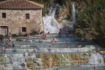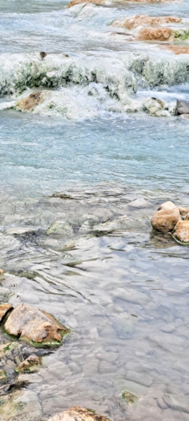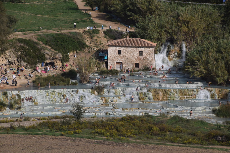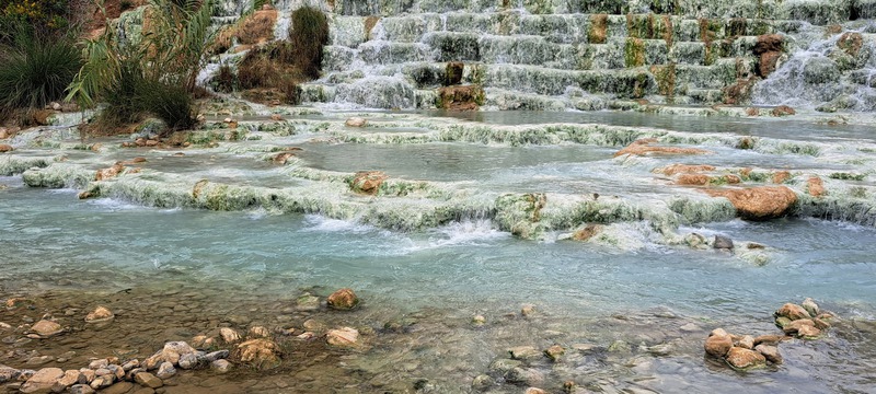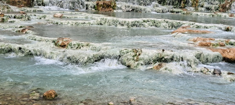 Veronika und Uwe (aus Freiburg), die wir an unserem Übernachtungsplatz kennen gelernt haben erzählten uns vor ihrer Abfahrt von den heißen Quellen und Kaskaden in Saturnio. Diese möchten wir uns heute anschauen, als fahren wir (nach einem kurzen Bad im Meer) die knapp 50 km. Der Stellplatz ist etwa 2 km von den Kaskaden entfernt, so dass wir diese Strecke mit den Rädern zurücklegen. Es ist erstaunlich, aber der Zutritt zu Quellen, Kaskaden und Fluss ist frei und so tummeln wir uns kurze Zeit später bei einer Wassertemperatur von 37° in den Becken der Therme.