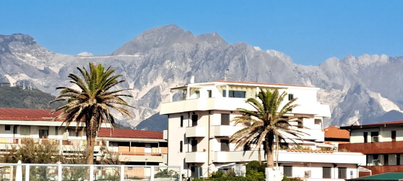 Weiter geht es nach Carrara, bzw. Marina di Carrara. Bevor wir jedoch in Marina di Carrara ankommen biegt Mario noch Richtung „Cave Marmo“ ab und wir fahren auf der Hauptstraße durch Carrara, diese verlassen wir später um zu den Steinbrüchen zu gelangen. Die Straße wird immer schmaler und wir nehmen die nächste Möglichkeit wieder Richtung Stadt zu kommen. Es ist richtig eng – gefühlt passt nur eine Hand zwischen „Gretchen“ den Häusern auf der rechten Seite und den Autos auf der Linken! Wir steuern einen Stellplatz an, keiner, außer ein paar Womos, da. Wir fahren trotzdem drauf.