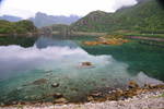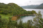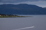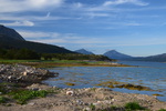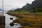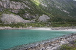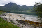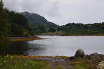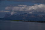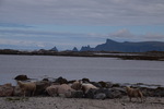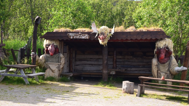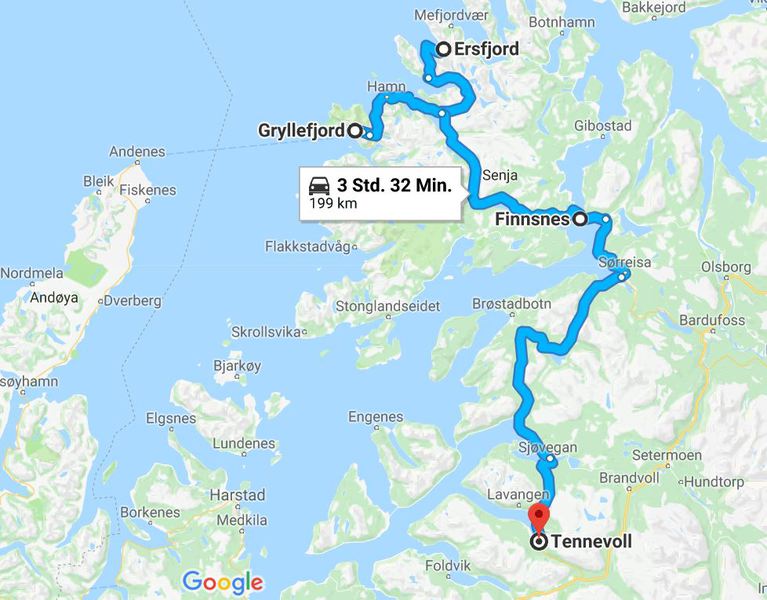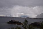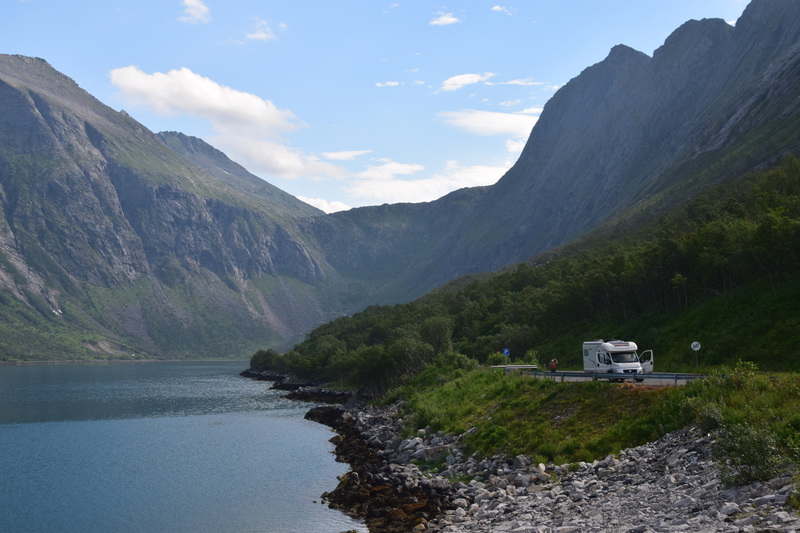 Bevor wir von diesem schönen Ort wegfahren gehen wir noch einmal baden. Wir fahren weiter an der Küste, bzw. an den Fjorden entlang und kommen durch eine tolle, sehr rauhe Landschaft bis zum Gryllefjord. Bevor wir Gryllefjord erreichen machen wir noch einmal Halt um uns den größten Troll Norwegens anzuschauen. Danach geht es quer über die Insel, die wir bei Silsand verlassen. Kurz vor Silsand biegen wir zu einem See ab. Dass auch Seen Ebbe haben, haben wir nicht gedacht und so „gehen wir“, im wahrsten Sinne des Wortes in den See. Wir waten bestimmt 500 m durch Wasser, das höchstens bis zur Wade reicht, bevor es endlich so tief wird, dass man (ohne den Boden unter den Füßen zu verlieren) ein paar Meter schwimmen kann. Danach geht es den halben See wieder zurück. In Finnsnes sind wir wieder auf dem Festland und es geht wieder an einem Fjord entlang, die Landschaft ist wenig spektakulär. Der Himmel zieht zu, wir sind auf der Suche nach einem Übernachtungsplatz, was nicht so einfach ist, da die Straße direkt am Wasser entlang führt und wenn ein Ort kommt hat er einen Campingplatz. Also fahren wir noch bis zu dem kleinen Ort Tennevoll, wo wir fast im vorbeifahren zwei Womos am Wasser stehen sehen – also nichts wie hin. Hier bleiben wir. Wir stehen gerade als es anfängt zu regnen und ein kleines Gewitter aufzieht.