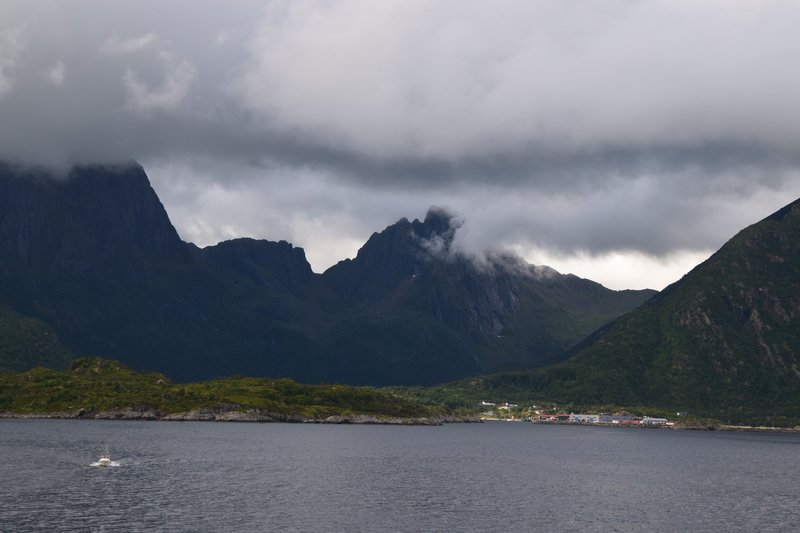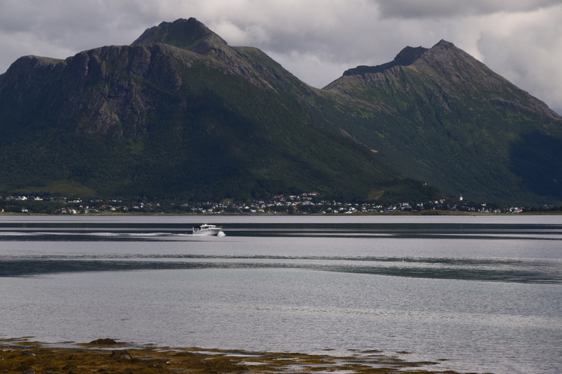 Das Wetter ist nicht mehr so schön, bis zum Anfang der Lofoten sind es noch knapp 40 km. Die ersten Kilometer legen wir auf der E10 zurück, dann machen wir einen Abstecher weg von der Hauptroute in einen 20 km langen Fjord ( hier fährt die Hurtugrute durch ). Sehr schön, aber durch das schlechte Wetter mit nur wenigen Stopps – also fahren wir die ganze Strecke wieder zurück (es gibt nur diese eine Straße). Wenige Kilometer später, wir haben die Lofoten erreicht, machen wir einen zweiten Abstecher, entlang der Küstenlinie, durch kleine Dörfer und treffen danach wieder auf die E10 auf der wir bis Svolvaer fahren. Ein Rundgang durch Fußgängerzone und Hafen folgt. Hier wird überall Werbung für Bootstouren (Fjordtour, Seevögeltour usw.) gemacht aber kein einziges Angebot für Waltouren. Zurück bei „Gretchen“ überlegen wir ob wir eine Tour buchen sollen, sind uns jedoch einig, dass wir lieber eine Walsafari machen wollen. Jetzt muss Freund Google herhalten und wir stellen fest, dass entgegen unserer Annahme und auch anderer Infos, im Sommer keine Walsafaris stattfinden – die Wale sind nur weiter nördlich, in Andenes, zu finden. Inzwischen ist es 16.30 Uhr und wir treffen eine verrückte Entscheidung – wir fahren zurück in den Norden. Bis Andenes sind es 220 km (ca. 80 km der Strecke machen wir nun zum 2. Mal). Um 20.00 Uhr sind wir am Ziel und besuchen das Walsafari-Büro – leider schon geschlossen, aber es liegt eine Liste zur Reservierung für morgen 16.00 Uhr aus wo wir uns eintragen in der Hoffnung, dass es funktioniert. Wir stellen uns für die Nacht in den Hafen.