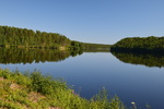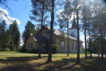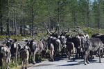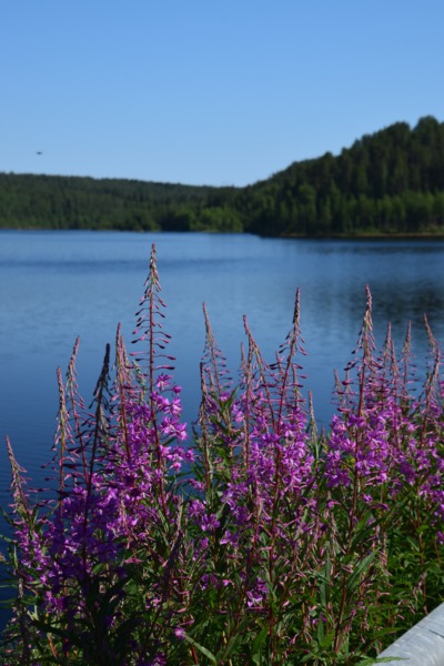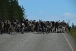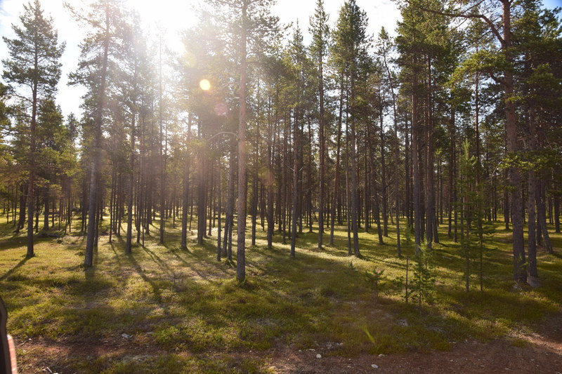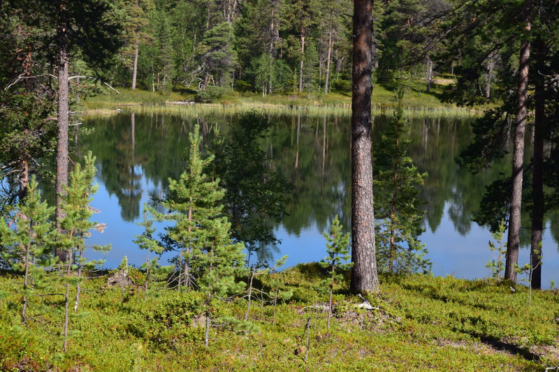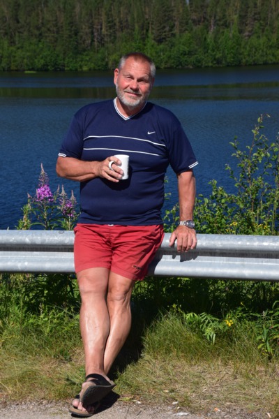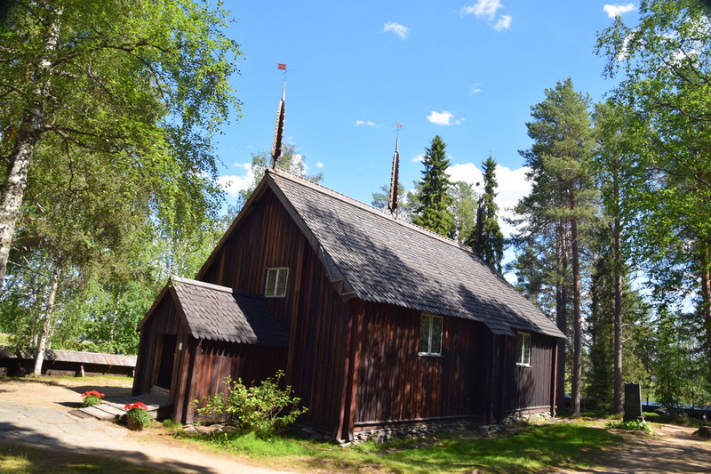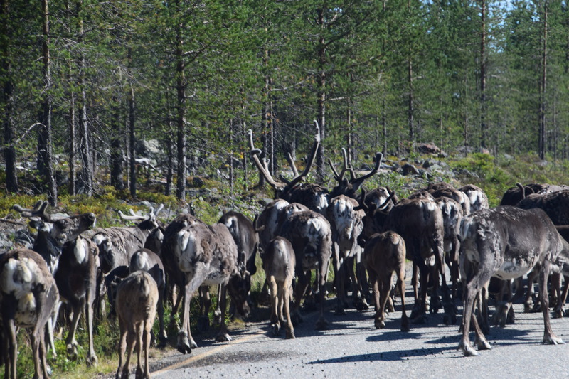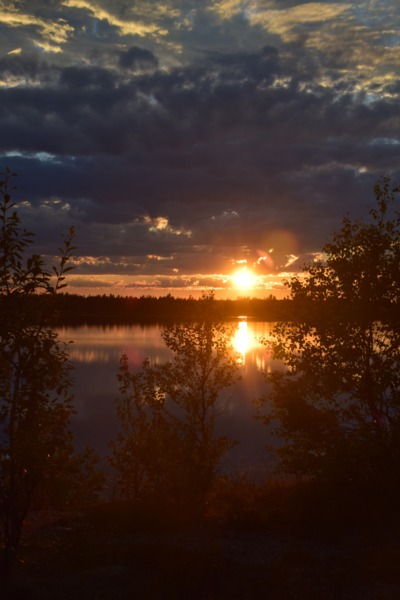 Obwohl wir alles dicht gemacht hatten, werden wir von Mücken fast wieder aufgefressen. Deshalb und auch wegen der Helligkeit kann ich, Helga, überhaupt nicht einschlafen. Um 2 Uhr überlegen wir, aufzustehen, zu frühstücken und unsere Sachen zu packen – machen wir dann aber doch nicht Wir starten nach einem Bad im See erst um 10 Uhr. Schon nach wenigen Kilometern, stoppen wir, weil direkt vor uns eine ganze Rentierherde auf die Straße und dann ganz gemächlich wieder zurück in den Wald läuft – ein herrliches Erlebnis!! Die einzige Stadt auf unserem heutigen Weg ist Sodankylä mit einem Stopp um die alte dunkelbraune Holzkirche von 1689 und das Denkmal eines Samen beim Bändigen seines Rentiers anzuschauen. Weiter geht es entlang des Flusses Kitinen mit seinen Stauseen. Hier finden wir heute, schon recht zeitig, unseren heutigen Bade- und Übernachtungsplatz. Laut unserer Wetterapp ist an unserem Standort Sonnenuntergang und -aufgang zur gleichen Zeit und zwar um 2 Uhr. Jetzt um 18.30 Uhr haben wir noch 28°.