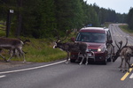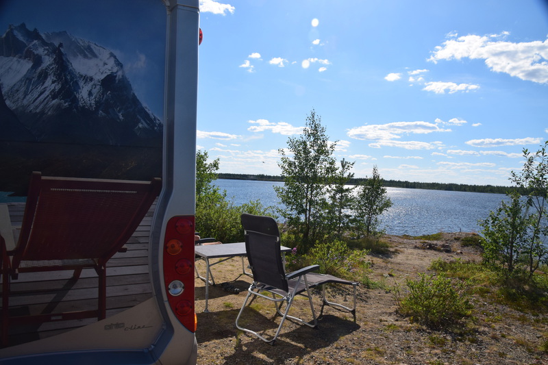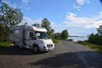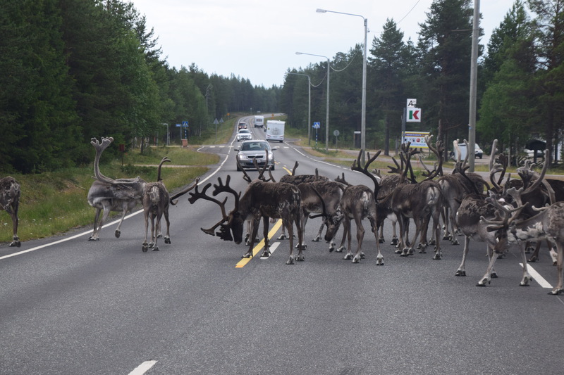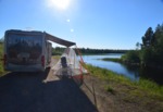 Als wir am Frühstücken sind kommt bis auf wenige Meter ein kleines Rentier an. In Rovaniemi besuchen wir heute noch das Museum „Arktikum“ – was uns wirklich begeistert hat. Die Ausstellungen, handeln vom Leben im hohen Norden. Die Filme die gezeigt werden handeln von den Nordlichtern und den Tieren. Die Ausstellung hat uns begeistert, wir waren 2 ½ Stunden auf Besichtigungstour. Da unsere Schiebetür mit Fliegengitter nicht mehr richtig funktioniert wollen wir Rovaniemi in einem Zubehörladen für Womos schauen ob wir etwas bekommen, das wir als Mückenschutz verwenden können. Wir bekommen einen Staubfänger (O-Ton Mario) und stellen fest, dass uns das nicht passt und wahrscheinlich auch nicht viel nützen wird. Also gehen wir in einen Outdoor-Laden und kaufen einen Mückenvorhang mit Magnetverschluss (wir sind stolz, etwas gefunden zu haben). Wir verlassen Rovaniemi und fahren auf einer kleinen Straße am Fluss entlang. Das Wetter ist so herrlich, dass wir, an der ersten möglichen Stelle halten und ein Bad im Fluss nehmen. Weiter geht es, wir sind so gut wie alleine auf der Straße, ab und an mal ein Auto oder auch ein Rentier und am Straßenrand vereinzelt Häuser. Wir finden nach ca. 100 km kurz vor einer Brücke, direkt am See unseren heutigen Übernachtungsplatz. Es hat viele Mücken, Bremsen und kleine Miniviecher (die beißen) – wir fahren unsere Markise aus und befestigen daran unser Moskitonetz, spannen dieses ab und stellen unsere Stühle und den Tisch darunter – jetzt haben wir Ruhe. Wir gehen im Unarise baden und genießen die Sonne.