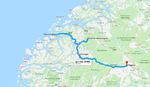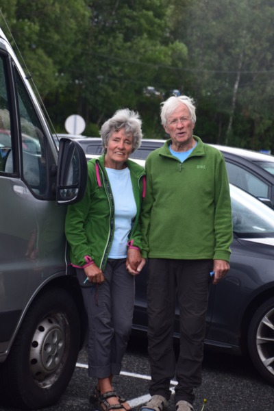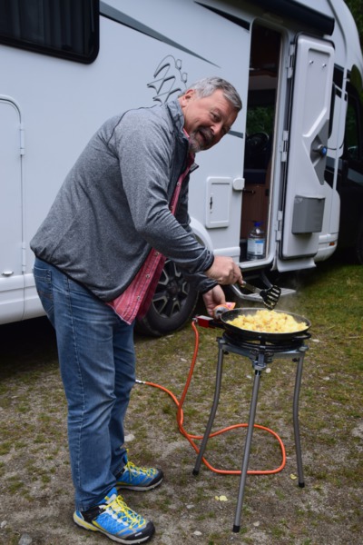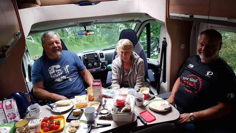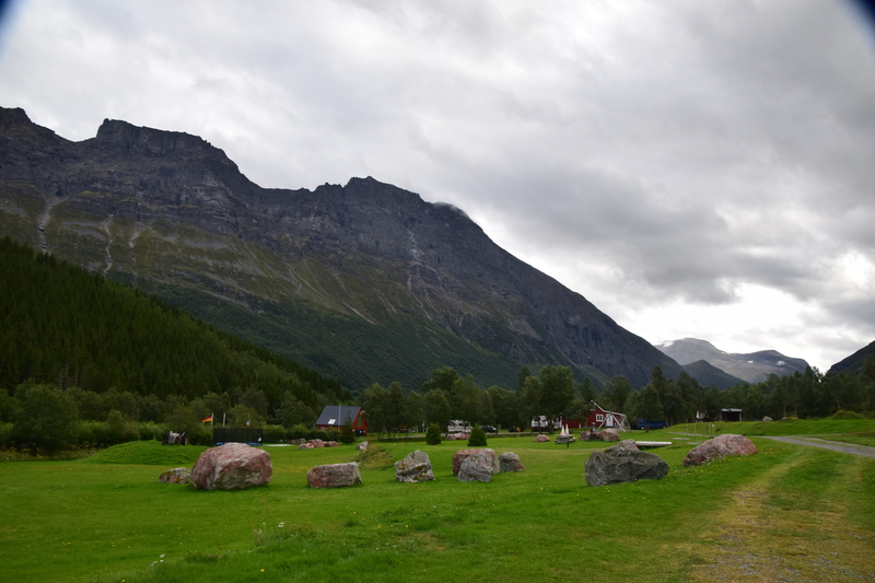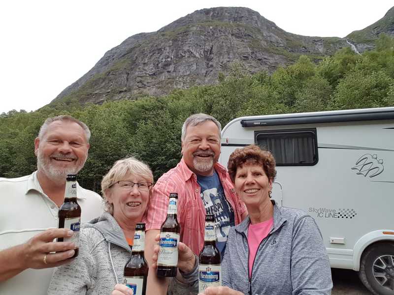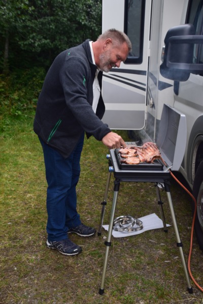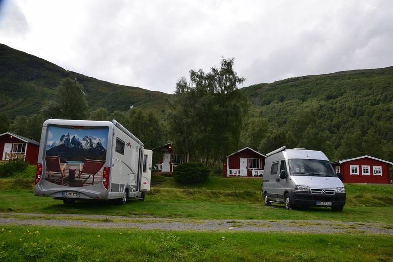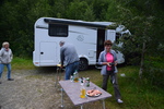 Wir verabschieden uns von Hans-Jürgen und Christa (die beiden fahren Richtung Heimat), wir fahren wieder nach Valldal zurück, wo wir uns mit Fritz und Elvira (Bekannte aus Oberried) treffen. Nach einer herzlichen Begrüßung und Kaffeepause auf dem Parkplatz am Hafen beschließen wir, den Abend zusammen zu verbringen. Da wir auf keinen Campingplatz möchten, bemühen wir wieder einmal unsere Apps um einen geeigneten Platz für uns zu finden. Diesen Platz finden wir; für uns liegt er eigentlich in der falschen Richtung – aber nur 28 km. Wir wollen grillen, die Männer räumen die Grills aus, es beginnt zu regnen. Grillen tun wir trotzdem, doch zum Essen sitzen wir drin (es ist kalt geworden). Wir verbringen einen wunderschönen Abend im Womo von den beiden.