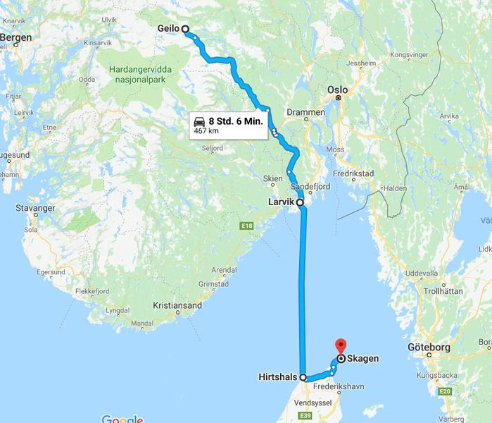 In der Nacht hatte wir 2° Außentemperatur, wir haben die Heizung auf kleiner Stufe angelassen. Unser Beschluss ist gefasst, wir werden heute noch nach Larvig fahren um dann zu sehen, wann wir mit der Fähre nach Hirtshals kommen. Wir fahren noch einmal durch eine wunderschöne Landschaft mit tiefen Flüssen, über 2 Pässe und baumlose Hochebenen. Ein Skigebiet mit wunderschönen Ferienhäusern reiht sich an das Andere. Wir fahren das Numetal entlang, machen Halt an der wunderschönen Stabkirche mit Freilichtmuseum in Uvdal um anschließend nach Kongsberg zu kommen. Ab dort wird die Landschaft eher langweilig. Irgendwie ist im Moment die Luft bei uns raus – auf Besichtigungen haben wir keine Lust mehr und so fahren wir in Larvik direkt an den Fährhafen und haben Glück, die Fähre nach Hirtshalts geht in 1 ½ Stunden und so kaufen wir uns gleich ein Ticket und verlassen Norwegen um 17.30 Uhr.