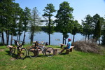 Die Sonne scheint wieder und wir beschließen eine Radtour am See entlang zu machen. Wir fahren von der Hauptstraße weg auf eine kleine Straße, die uns entlang des Sees und vieler schöner Ferienhäuser, Hotels und Anlagen mit Seezugang führt – wir kommen jedoch nicht an den See zum Baden, das es keine öffentlichen Zugänge gibt. Wir fahren weiter, kommen über einen Feldweg in den Wald. Zu Beginn ist der Weg auch noch schön, dies ändert sich aber mit jedem gefahrenen Kilometer. Durch den gestrigen Regen ist der Weg aufgeweicht und gespickt mit großen und kleinen Pfützen. Mal muss man durchfahren, mal kann man absteigen und das Fahrrad um die Pfütze herum schieben. Was aber relativ schnell passieren muss (wir befinden uns mitten im Mückenbrutgebiet ?). Ursprünglich wollten wir eine Runde fahren, stellen aber fest, dass wir zurück, entweder auf einer Hauptstraße fahren und einen großen Umweg machen müssen oder auf dem gleichen Weg zurückfahren. Also fahren wir den gleichen Weg zurück, wieder durch Pfützen und Mückenschwärme. Zurück in Mikolajki gönnen wir uns, so dreckig wie wir sind, erst einmal ein Bier. Zurück bei „Gretchen“ spritzen wir erst einmal unsere Räder ab und gehen anschließen duschen. Danach sitzen wir noch mit anderen Campern zusammen.
