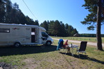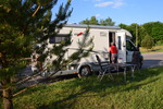 Wir verlassen Mikolajki. Laut unserer Straßenkarte gibt es eine „landschaftlich schöne Straße“, diese ist etwas breiter, als der Weg den wir gestern mit den Rädern gefahren sind, hat aber genauso viele Schlaglöcher, die immer noch mit Regenwasser gefüllt sind. Die Strecke ist auf jeden Fall für Fahrzeug und Fahrer anspruchsvoll. Für diese 6 km Straße haben wir ca. 1 Stunde gebraucht! Danach kommen wir wieder auf eine „normale“ Straße. Auf dieser fahren wir über Orzysz (hier machen wir ein Badestopp) nach Elk, wo wir einen Bummel machen und uns ein Eis gönnen. Unser angepeiltes Tagesziel ist der Grenzbereich nach Litauen, was wir aber nicht erreichen. Die 45 km von Elk nach Augustow sind schnell gefahren. Bei Augustow gibt es 3 Seen, einen steuern wir an und finden einen schönen Platz zum Baden und auch zum Übernachten.