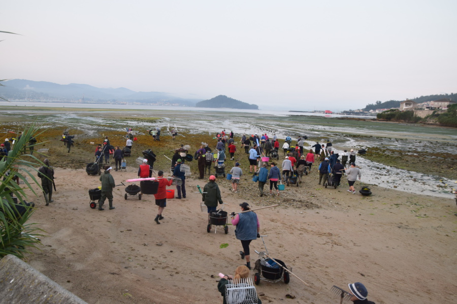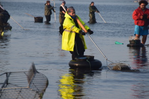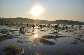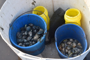 geworfen. Die Sammler kommen zurück und in einer Art Container werden die Muscheln nach Größe sortiert und gewogen.