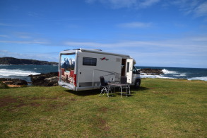 Seitenstreifen der Küstenstraße mit Promenade richten wir uns ein. Inzwischen regnet es wie aus Eimern. Wir haben es aber gemütlich und warm.