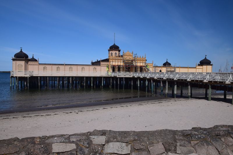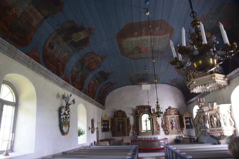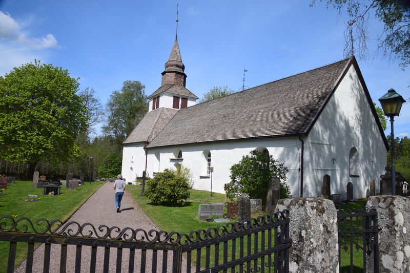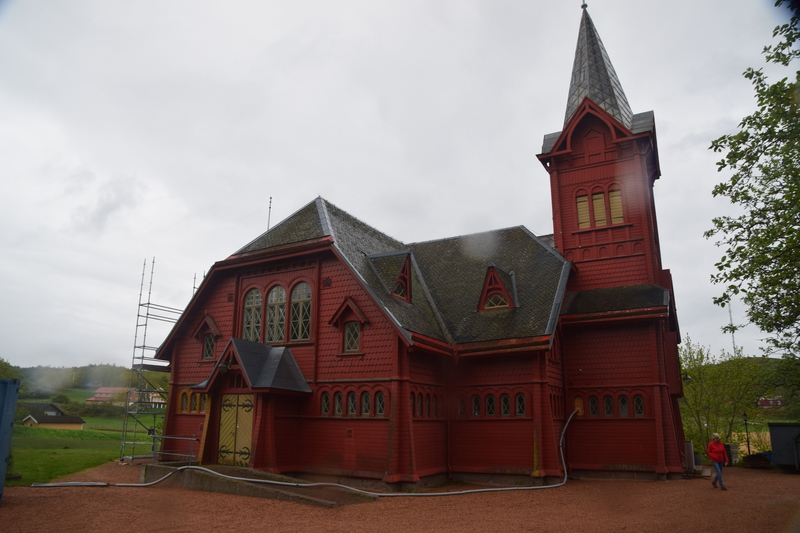 Bereits um 6 Uhr scheint die Sonne ins Womo. Es ist verdammt kalt und ich stehe auf um die Heizung an zu machen (im Womo sind es gerade mal 10°). Als wir dann um 7.30 Uhr aufstehen ist es angenehm warm im Auto. Nach dem Frühstück nehmen wir unsere Kaffeetassen und gehen zum Badestrand. Mario geht kurz ins Wasser (12°), anschließend machen wir „Gretchen“ wieder reise fertig und fahren nach Femsjö. Ein kurzer Stopp ist die alte, noch betriebstüchtige Säge am Wegesrand wert. In Femsjö besuchen wir die alte schindelbedeckte Kirche mit den Deckenmalereien aus dem Jahre 1749. Anschließend gehen zur Info, wo auch auf Deutsch, über die Gegend, Fauna und Flora sowie über den berühmten Sohn der Stadt, Elias Fries, informiert wird. Weiter geht es nach Falkenberg, interessant hier ist allein die Zollbrücke „Tullbron“ die über den Ätran führt. Die Stadt selbst hat außer schön angelegten Blumengärten nicht viel zu bieten. Viele Geschäfte stehen leer. Wir verlassen Falkenberg in Richtung Varberg. Wir richten uns, nachdem wir den Zugang zu freien Übernachtungsplätzen nicht gefunden haben, auf dem Stellplatz „Lövstavikens Smabatshamn“ ein. Als wir aus dem Anmeldhäuschen kommen, frägt uns ein deutsches Paar, was wir für den Platz bezahlt haben. Es beginnt so eine nette Unterhaltung und die beiden erzählen uns, dass sie nur wenige Meter entfernt am Meer stehen. Da wir haben schon bezahlt haben, bleiben wir. Der Platz ist recht gut und so holen wir zum ersten Mal auf unserer Tour Tisch, Stühle und Grill raus.
