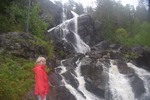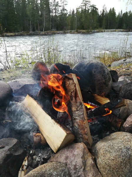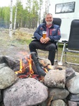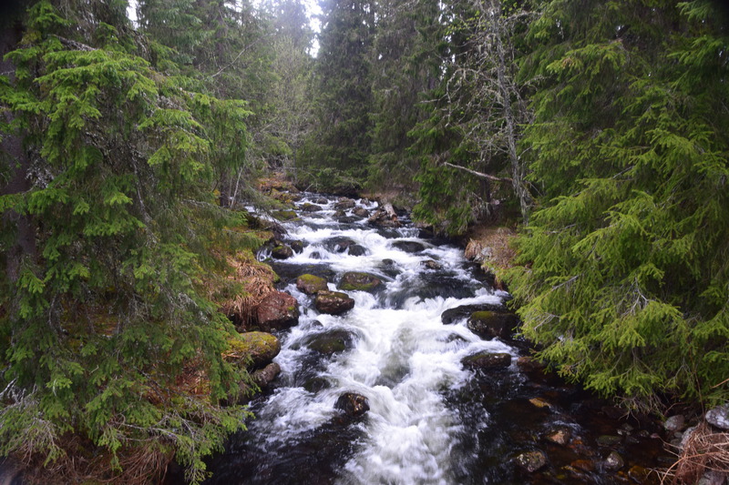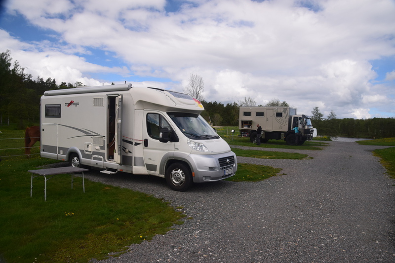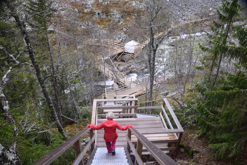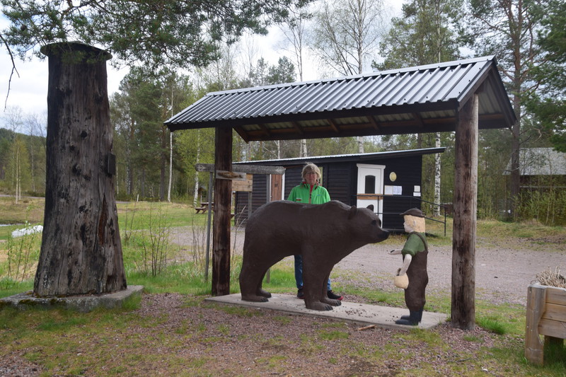 Wir fahren Richtung Särna. Die Straße führt direkt am Elch- und Huskypark „Bosse and Friends“ vorbei. Selbstverständlich biegen wir auf den Parkplatz ein und genauso selbstverständlich ist der Park geschlossen. Kurz vor Särna biegen wir noch einmal ab, um auf einer unbefestigten Straße zum Mickeltemplet, ein roter hölzerner Aussichtsturm, hinaufzukurven. Wir erreichen nach diesen Abstechern Särna, wo wir die Gammelkyrka, eine winzige alte Holzkirche besuchen möchten – selbstverständlich geschlossen, jedoch um die Kirche herum befindet sich eine Art Freilichtmuseum mit alten Ställen, Vorratskammern und Wohnhäusern. Wenige Kilometer nach Särna nehmen wir den Abzweig nach Mörkret, um zum Njupeskär (Wasserfall) zu gelangen. Wir stellen „Gretchen“ am großen Parkplatz ab und beobachten als erstes ein Unglückshäherpärchen, das Männchen bewegt sich aufgeblustert um seine Angebetete herum. Wir betreten den Nationalpark Fulufjällets und beginnen den Rundweg zum Wasserfall, der einen freien Fall von 125 m hat. Nach knapp 2 Stunden sind wir wieder zurück. Wir starten wieder und fahren Richtung Norwegen – biegen dann aber wieder auf eine Schotterstraße ab und fahren am Oberlauf des Fulan entlang. Kurz vor Idre kommen wir auf eine Teerstraße und fahren knapp 10 km Richtung Mora. An der Straße kommt ein Hinweisschild „Lägerplats“ rechts, das sehen wir uns doch mal an und siehe da wir kommen an einen schönen Platz, ausgestattet mit kleiner Hütte, Plumsklo und einigen Grillstellen. Hier bleiben wir, wir sind ganz allein und stehen direkt am Fluss „Österdalälven“. Wir entrichten eine Gebühr von 6 € in einen aufgestellten Kasten. Nun können wir uns an den Holzscheiten bedienen und ein Lagerfeuer entzünden. Bereits um 16.30 Uhr brennt unser Feuer, wir holen unsere Stühle direkt ans Feuer. Eine halbe Stunde später beginnt es zu regnen, Mario fährt die Markise aus und wir rücken ein paar Meter zurück unter unser Dach. Als es aufhört zu regnen, bestückt Mario unseren Grillrost mit Fleisch und legt ihn auf die Feuerstelle. Es ist inzwischen ziemlich kalt, ca. 10°, wir bleiben eisern bis kurz vor22 Uhr am Feuer sitzen.