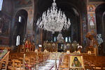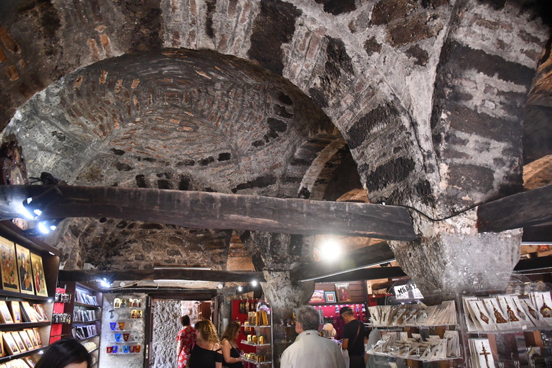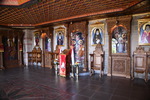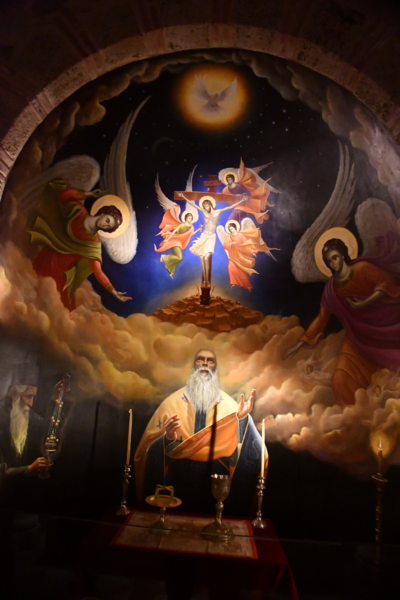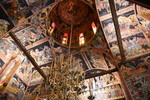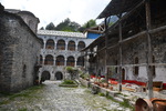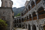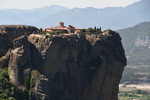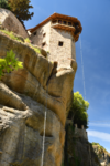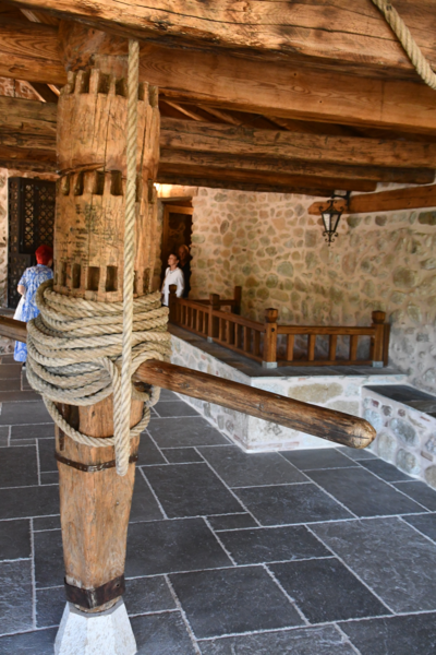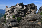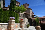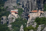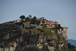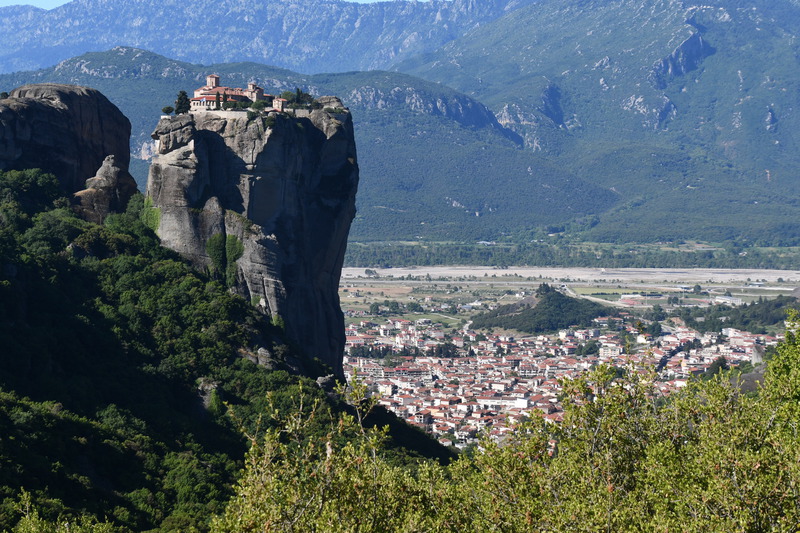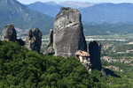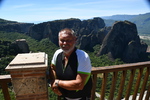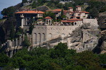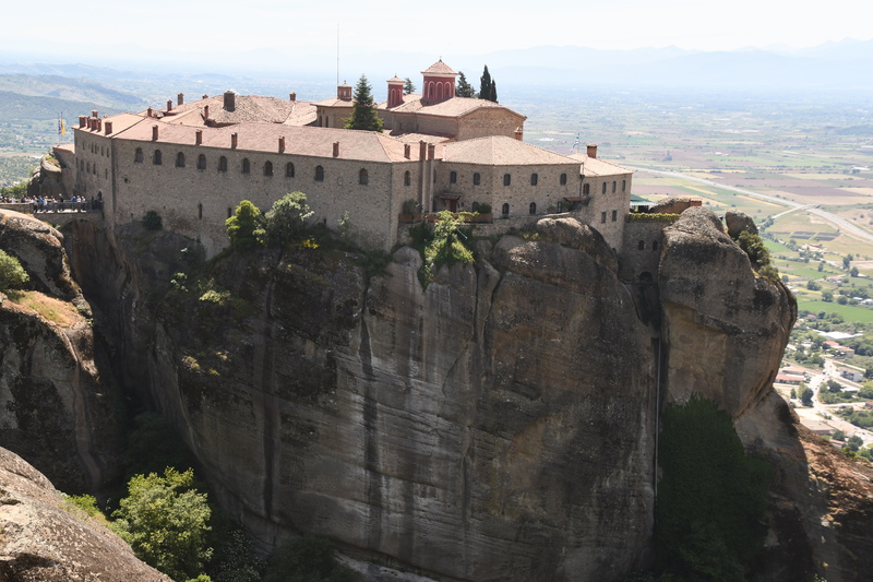 Da unser Kühlschrank am Strom hing, hat der Geruch nachgelassen und er hat auch wieder begonnen seine Arbeit aufzunehmen. Wir nehmen unsere Fahrräder um die Meteora-Klöster anzufahren. Nach wenigen Kilometern, wir haben immer wieder Blick auf das eine oder andere Kloster, nehmen wir einen falschen Abzweig und entfernen uns von diesen. Wir bemerken unseren Fehler zwar, fahren aber trotzdem weiter um letztendlich nach 17 km wieder umzukehren. Schade ist nun, dass wir spät an die Aussichtspunkte kommen und es an diesen nur so von Touristen (Japaner u.a.) und auch Griechen wimmelt. Wir fahren zum Kloster Varlaam, suchen einen sicheren Platz für unsere Räder und gehen zu Fuß über eine Brücke zum Eingang. Hier muss ich mir, da ich in kurzer Hose bin, ein Tuch umbinden (hatte ich dabei!). Mario durfte, trotz seiner nur knielangen Radhose das Kloster betreten. Als erstes ging es ins Museum mit Sammlungen alter Handschriften, Urkunden und Gewändern. Außerdem wurde in Bildform das Leben der Mönche aufgezeigt.