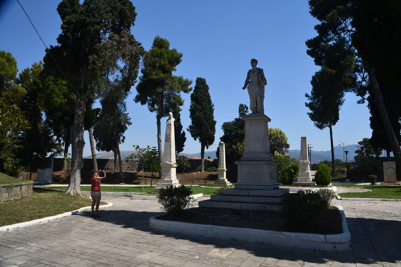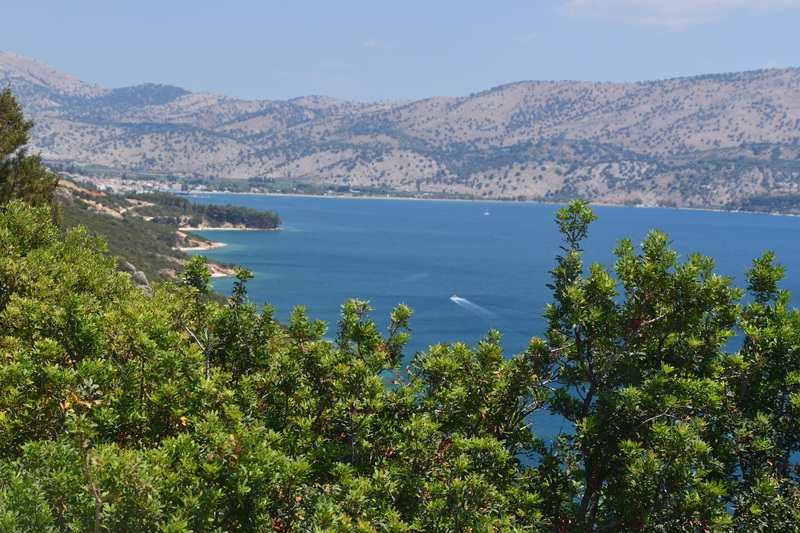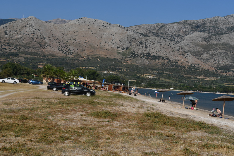 Wir verlassen unseren schönen Platz und fahren nach Messolongi. Gleich nach dem Stadttor kommt man zum „Park der Helden“. Wir stellen „Gretchen“ ab und bummeln durch den Park. Viele Statuen, Marmortafeln und Monumente erinnern an den Kampf der Griechen in den Jahren 1824/26. Über einen 5 km langen Damm fahren wir anschließend zum Badestrand Tourlida. In der flachen Lagune Limnothalassa befinden sich schöne Stelzenhäuser. Nach einem kurzen Bummel fahren wir weiter. Es ist so heiß, dass unsere Aktivitäten immer mehr nachlassen. Bei Pogonia an einem schönen Sandstand finden wir unseren Bade- und Übernachtungsplatz. Direkt neben uns wird ein Wassersportbereich eingerichtet – hier scheint am Wochenende der Betrieb los zu gehen.