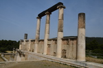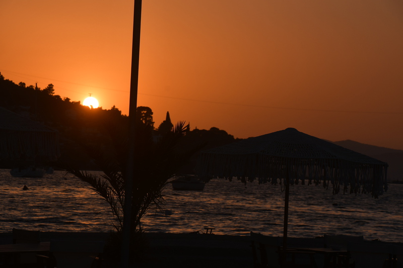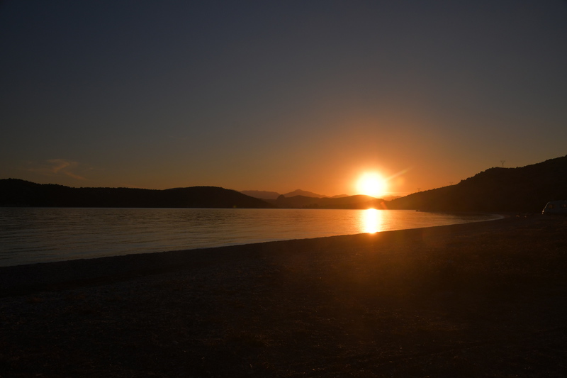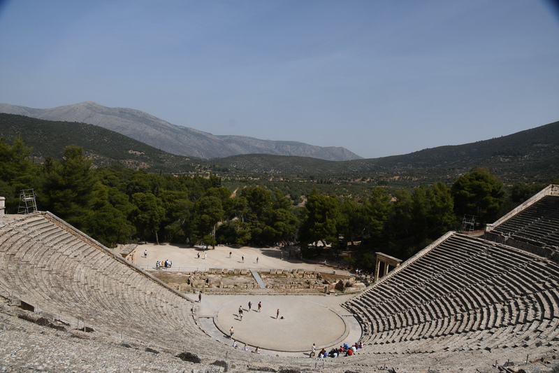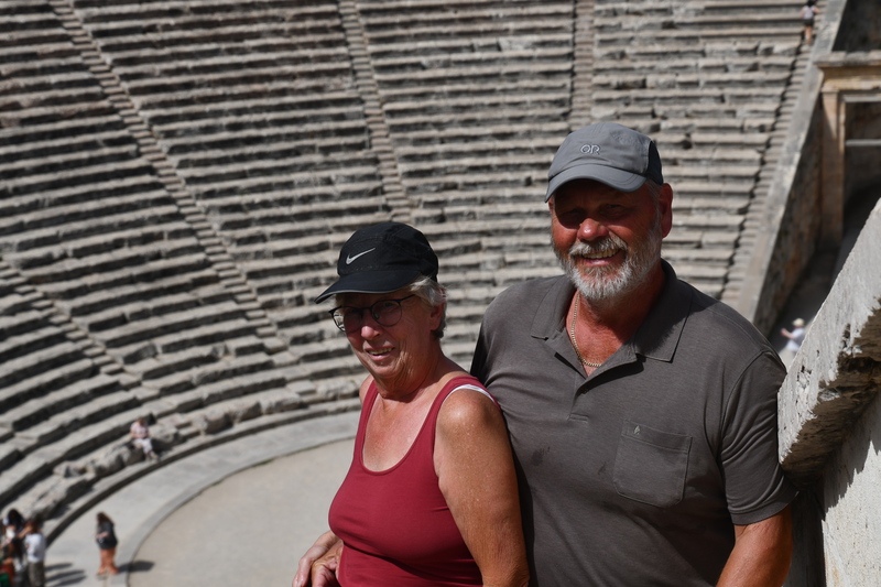 Wir verlassen Korfos um nach Epidauros zu kommen. Vorbei an Nea Epidauros geht es noch ca. 20 km ins Landesinnere bis wir die Ausgrabungsstätten von Epidauros erreichen. Wir wenden uns als erstes zum Theater aus dem 4. Jhr. v. Chr.. Auf seinen 55 Sitzreihen finden noch heute, während der Epidauros-Festspiele, 15.000 Zuschauer Platz. Von Juli bis August werden hier antike Dramen aufgeführt. Selbst in der obersten Reihe kann man das Fallen einer Münze hören. Wir besuchen das kleine Museum und wandern durch die Ruinenstadt. Inzwischen sind einige Busse angekommen und die Menschen strömen zu den Ausgrabungen, als wir diese bereits verlassen. Wir fahren zurück nach Nea Epidauros, finden einen schönen Stellplatz etwas außerhalb und nutzen den Nachmittag mit baden. Abends bummeln wir in den Ort um Essen zu gehen.Unser Übernachtungsplatz ist anscheinend auch Treffpunkt der Einheimischen, die hier am späten Abend eintreffen und sich bis gegen Mitternacht aufhalten.