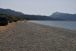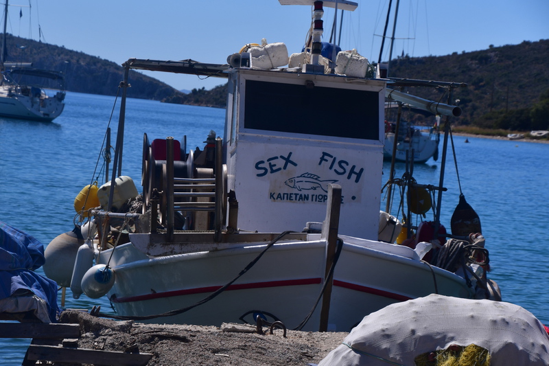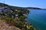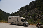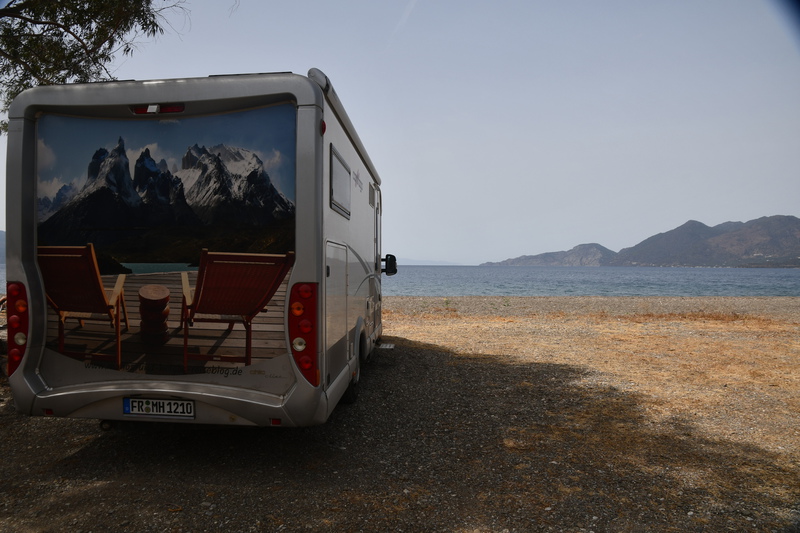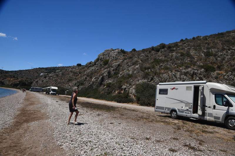 Wir verlassen unseren schönen Übernachtungsplatz und steuern Emioni an. Am Ortsbeginn befindet sich ein Supermarkt, wir nehmen die Gelegenheit war und gehen einkaufen, anschließend fahren wir in den Hafen, bekommen, da Markt ist aber keinen Parkplatz. Jetzt bereuen wir den Einkauf im Supermarkt – wir suchen in einer Seitenstraße einen Platz und gehen zum Markt. Wir kaufen Erdbeeren und Fisch und fahren weiter. Vorbei an Kranidi (lt. Buch soll man auf keinen Fall durch den Ort fahren) kommen wir nach Portoheli, kurz danach sind wir am Ende (unsere Straße hört auf, bzw. sie mündet in einen Feldweg). Jetzt heißt es umkehren und so erreichen wir wieder Kranidi und die Straße auf der wir uns befinden, geht mitten durch. Wir schaffen es, stellenweise ist es aber eng und steil. Als Ziel haben wir die Koordinaten einer Bucht in der Nähe von Kandia eingegeben. Plötzlich lässt uns unser Navi abbiegen – die Straße sieht zu Beginn recht gut aus, was sich aber nach einigen 100 Metern aber ändert – dann ist Schluss, die Straße endet. Also wieder zurück auf die Hauptstraße, vorbei an Rado und dann wieder nach links – diesmal folgen wir der Straßenbeschilderung nach Irion und erreichen danach die Bucht, die wir anvisiert haben. Es ist herrlich hier – glasklares Wasser und Sonne pur!