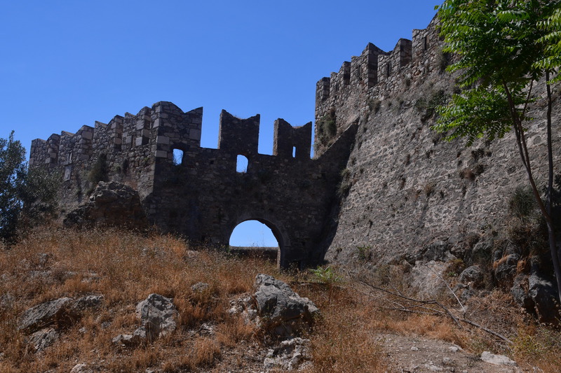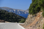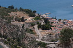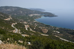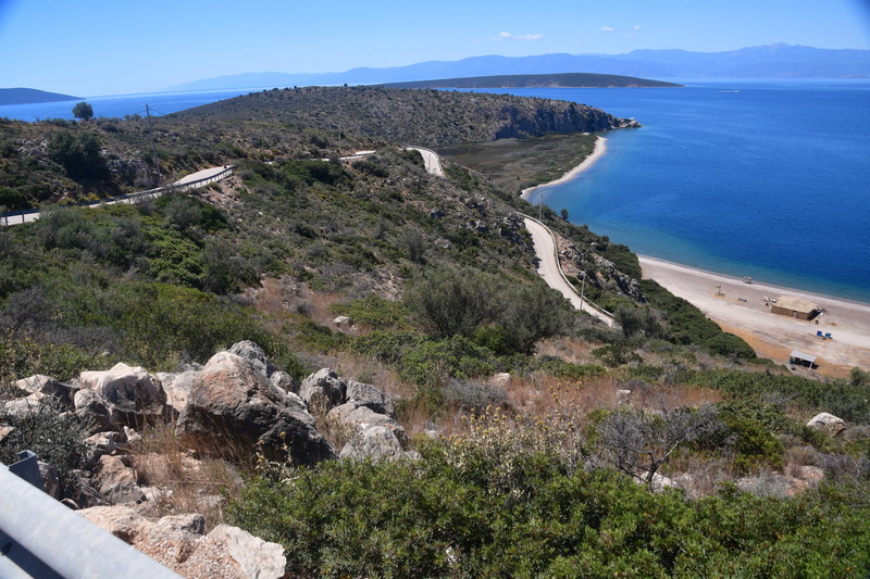 Zum ersten Mal frühstücken wir im Freien, packen anschließend ein und fahren weiter. Wir machen einen Fehler und landen auf der Autobahn, was Mario richtig ärgert. Bei der ersten Möglichkeit die Autobahn zu verlassen fahren wir ab,müssen aber trotzdem 7,-€ bezahlen, sind jedoch von unserem angestrebtem Ziel weit entfernt. Wieder einmal geht es quer durch die, hier nicht so hohen Berge, und vor allen Dingen durch Olivenhaine, eine Schildkröte läuft direkt neben der Straße. In einem Dorf nehmen wir einen kleinen Abzweig und schaffen es gerade so, in einer Kurve zwischen den Mauern durchzukommen. Dieser Weg war kurz und wir hätten es uns sparen können, denn wenige Meter später sind wir wieder auf der, auch nicht gerade breiten Hauptstraße. Wir fahren auf die Küste zu und haben von hier oben einen tollen Blick. Wir erreichen die Hauptstraße, von der wir nach wenigen Kilometern wieder abfahren unser Ziel ist das Örtchen Korfos, das direkt in der Bucht liegt. Wir fahren durch den Ort und halten nach einem Bade- und Übernachtungsplatz Ausschau.