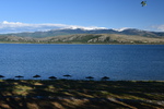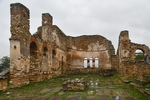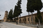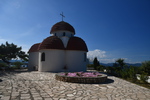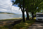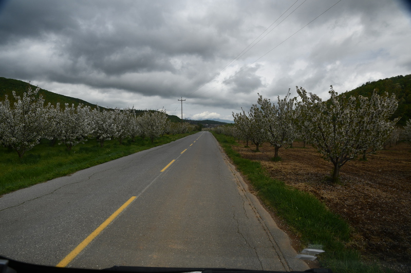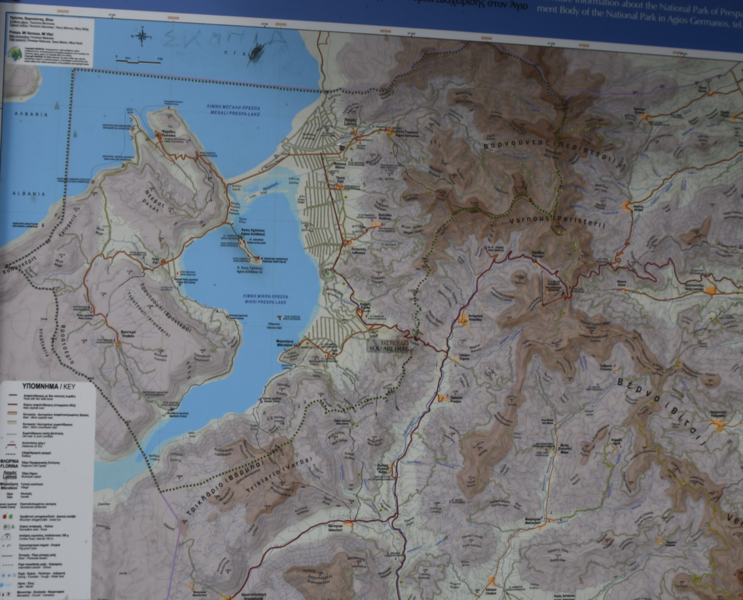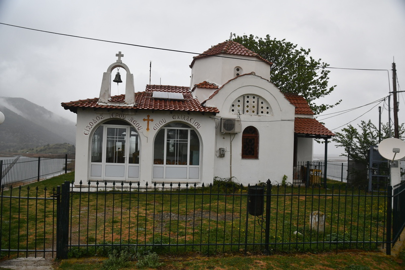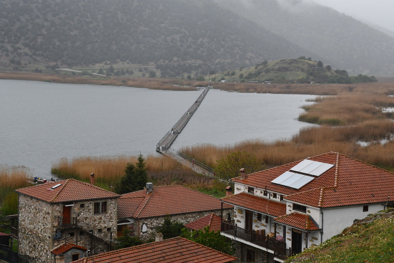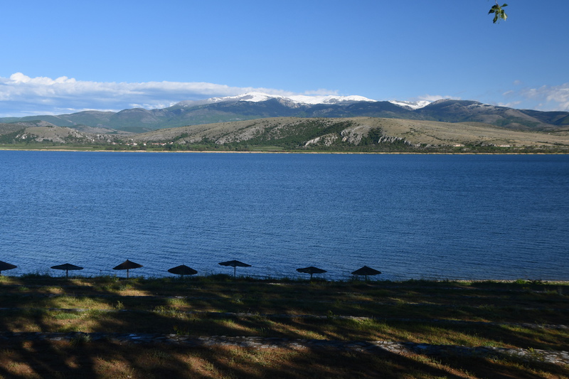 Der Tag beginnt mit leichtem Regen. Wir verlassen den Kastoriasee. Nehmen in der Stadt eine andere Abzweigung wie unser Navi vorgibt, bei einem Kreisverkehr treffen wir auf die Kirche, die selbst mit regenverhangenem Himmel Eindruck hinterlässt. Unser Navi hat umgestellt und so bleiben wir in unserer eingeschlagenen Richtung. Die Straße führt uns vorbei an herrlichen Häusern, von denen man einen tollen Blick auf den See hat. Als wir aus dem Stadtbereich raus sind, wird die Straße wieder einmal schlecht und wir sind ganz alleine. Wenigsten bis wir auf eine Kuh-/Rinderherde treffen, die uns den Weg teilweise versperrt. Nach ca. 20 km treffen wir dann auf die Hauptstraße auf der wir bei wieder stärker werdendem Regen nach Mikrolimni und von dort an den kleinen und großen Prespa-See mit dem Städtchen Psarades fahren. Hier stellen wir „Gretchen“ ab, ziehen die Regenjacken an und bummeln auf der Strandpromenade bis zum Ende des Dorfes. Wir treffen hier nur auf ein paar Hunde, die uns des Wegs begleiten. In den zahlreichen Tarvenen werden die Tische eingedeckt – anscheinend werden Besucher erwartet. Wir fahren weiter, hatten wir doch einige Kilometer zuvor am Abzweig den Hinweis auf die Basilika Agios Achlios und dem Kloster Panagias Porfiras entdeckt. Auf dem Parkstreifen am Straßenrand stehen doch tatsächlich 3 Busse! Das Inseldörfchen, auf der sich die Ruinen der Basilika und des Klosters befinden, ist über einen 8-Minuten-Fußgängerüberweg zu erreichen, also los geht’s im strömenden Regen. Schon nach diesen 8 Minuten sind wir bereits durchnässt, gehen aber eisern weiter, werfen einen Blick in die kleine Kirche und gehen zur Ruine der Basilika – die weiteren Anlagen sehen wir uns nicht mehr an. Nass und kalt erreichen wir „Gretchen“, ziehen uns trockene Sachen an und kochen Kaffee. Da wir nach Edessa möchten, müssen wir über den 1558 m hohen Pisoderion-Pass. Schon bevor es steil bergauf geht, geht der Regen in Schnee über. Der Schneefall wird immer heftiger, die Straße ist innerhalb weniger Kilometer mit Schnee bedeckt, es wird schmierig und ca. 200 m unterhalb der Passhöhe, kommt das vorläufige Ende unserer Fahrt, wir rutschen und bleiben hängen. Mario rollt etwas zurück um einen neuen Versuch zu starten – erfolglos. Zwei Autos, die, als wir stehen, an uns vorbeifahren (rutschen), kehren wieder um. Mario zieht sich wieder die nasse Jacke an, eine frische Hose (die von vorher ist so nass, dass er sie nicht mehr anziehen kann) und macht sich daran, die Schneeketten aufzuziehen. Gut, dass wir diese immer im Womo haben (in den letzten 8 Jahren nicht einmal gebraucht). Ich koche zwischenzeitlich Tee über den sich Mario freut, als er, nachdem eine Kette drauf war, zum Aufwärmen ins Womo kam. Einige Zeit später, die andere Kette ist auch aufgezogen und Mario wieder in trockenen Kleidern, setzen wir unseren Weg fort – „wir schleichen bis zur Passhöhe“ und auf der anderen Seite wieder hinunter, der Schneepflug kommt uns entgegen und als wir wieder auf einer Höhe von ca. 1300 m sind, können die Ketten wieder runter. Ab jetzt geht es schneller – wir steuern Florina und anschließend ein Weingut in der Nähe von Aminteo an, entschließen uns jedoch, dem Weingut heute keinen Besuch mehr abzustatten. Es hat aufgehört zu regnen und wir fahren zum Vegoritida-See, wo wir die Nacht verbringen werden.