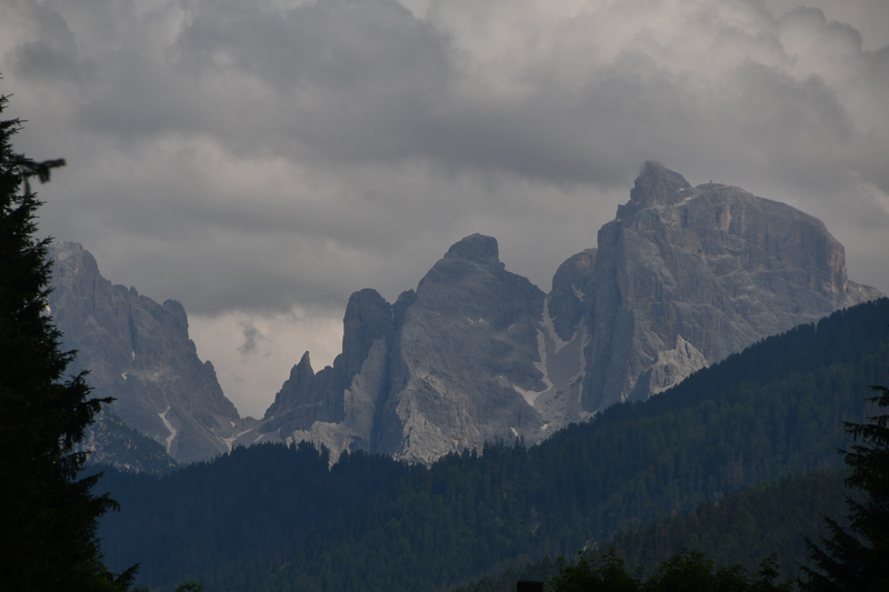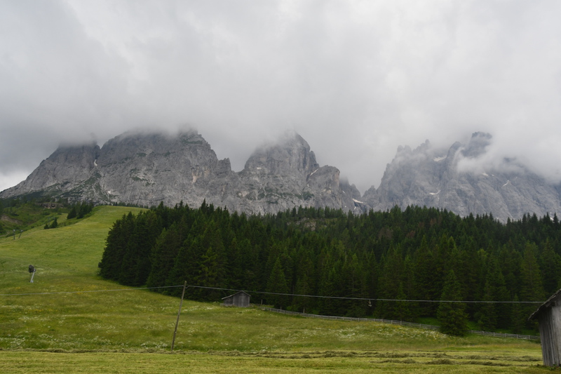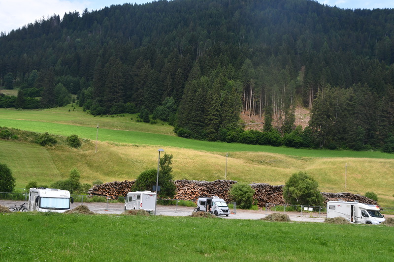 Wir befinden uns am Anfang der Dolomiten und es geht endlich mal wieder kurvig hinauf. Nach 19 Serpentinen erreichen wir den ersten Pass. Leider ist das Wetter nicht mehr ganz so schön, die Berggipfel sind fast immer in den Wolken. Die Gipfel der „Drei Zinnen“ können wir durch eine aufgelockerte Wolkendecke dennoch erblicken. Der Pass M. Croce di Comelico mit einer Höhe von ca. 1.600 m wird überquert. Ab Sexten beschäftigen wir uns damit, einen geeigneten Platz zu finden. Letztendlich stellen wir uns im Ort Monguelfo Weißberg auf einen (nicht besonders schönen) ausgewiesenen Stellplatz der Gemeinde.