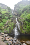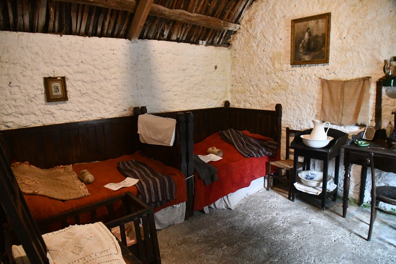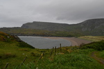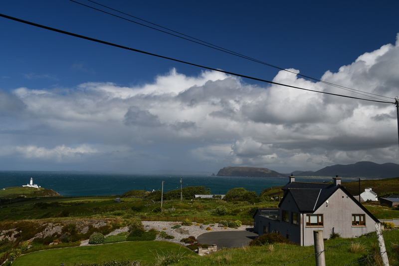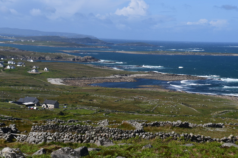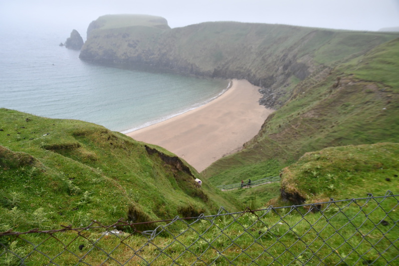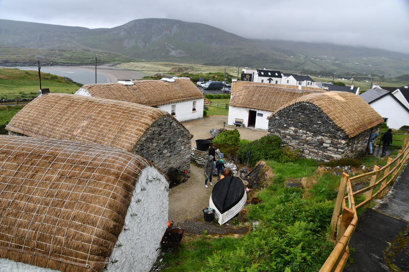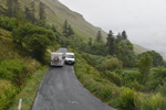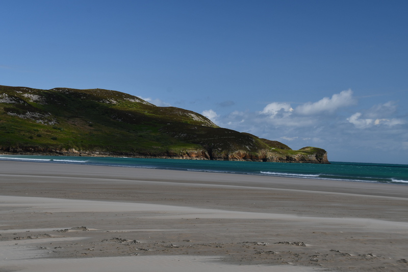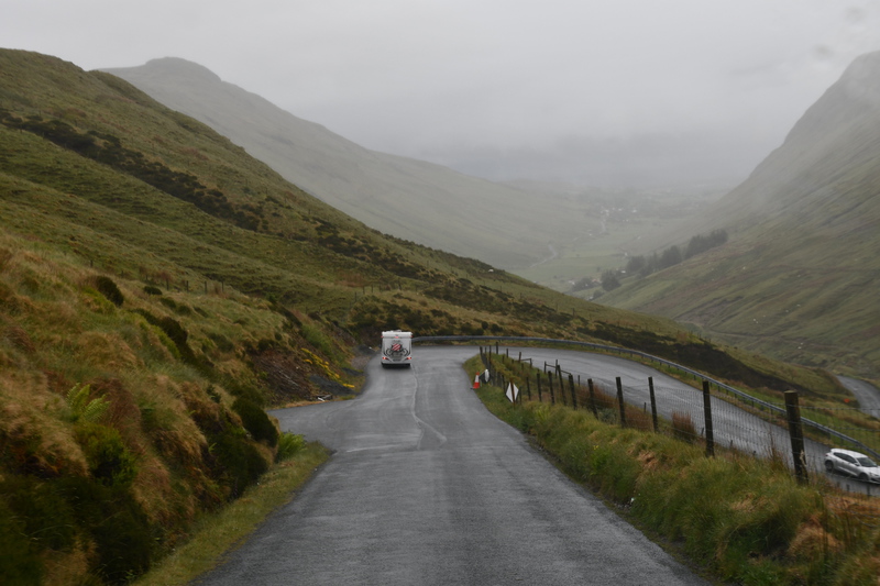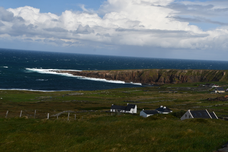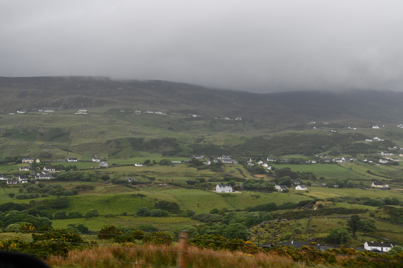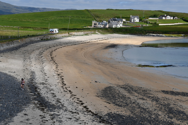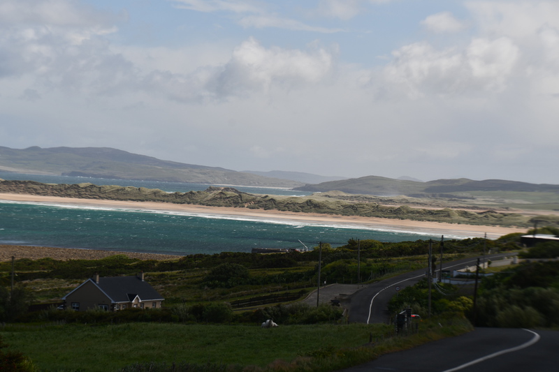 Wir verlassen unsere schöne Bucht. Das schöne Wetter hat uns verlassen, aber noch regnet es nicht. Wir verlassen die Landzunge auf dem gleichen Weg den wir gekommen sind (es gibt keinen anderen) bis wir die R 263 (Wild Atlantic Way) und auf dieser Straße, die als landschaftlich besonders reizvoll gilt, weiter Richtung Norden fahren. Wir haben gelesen, dass es im Hafen von Killybegs frischen und geräucherten Fisch zu kaufen gibt, was aber leider nicht so war. Killybegs ist ein bedeutendes Fischverarbeitungszentrum und hat den tiefsten Seefischereihafen Irlands. Wir fragen im Hafen nach Fisch und bekommen die Adresse eines kleinen Fischgeschäftes. Bevor jedoch dorthin fahren machen wir einen ersten „Regenspaziergang“ in Irland. Nach dem Einkauf von Fisch fahren wir weiter die Küste entlang und heute ist es wirklich schade, dass man fast keine Sicht hat. In Clencolumbkille stoppen wir, um dem dortigen „Folk Village Museum“ einen Besuch abzustatten. Dieses wurde 1967 von „Father James McDyer“ (Pfarrer) gegründet und erzählt die Geschichte und Entwicklung dieser strukturschwachen Ecke Irlands. Weiter geht es nach Malin Beg, wo wir oberhalb des „Silver Strand“ parken. Einen Spaziergang hinunter zum schönen Strand machen wir, angesichts des Regens nicht. Als fahren wir nach einer Kaffeepause wieder zurück nach Clencolumbkille und von dort auf der R 230, „Wild Atlantic Way“, der sich nicht nur als Wild Atlantic Way, sondern auch als Straße des „wilden Ritts“ entwickelt. Es rumpelt und scheppert in unserem Wagen, der Geräuschpegel ist sehr hoch. Die sehr enge Straße stellt bei Gegenverkehr eine Herausforderung dar. Wir kommen nach Ardara, (Thomas nimmt kurz vor der Stadt einen Abzweig, sein Navi zeigt einen Übernachtungsplatz an, der sich aber als nicht vorhanden erweist. Der Platz in der Stadtmitte ist zur Übernachtung auch nicht geeignet und so fahren zu einem empfohlenen Platz am Wasserfall von Maghera – sehr schön, hier bleiben wir.