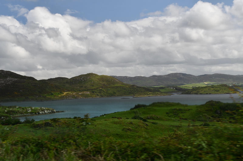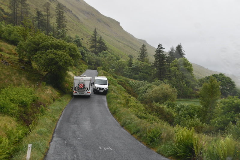 Von unserem schönen Übernachtungsplatz geht es wieder zurück nach Ardara und weiter nach Norden, immer auf dem „Wild Atlantic Way“ hier mit der Straßennummer R261 und N56, diese beiden Straßen haben eine normale Breite. Dies ändert sich, als wir bei Doocharry auf die R254 einbiegen (unser „Gretchen“ benötigt die ganze Straße). Wir fahren durch eine Landschaft, die uns sehr nach Norwegen erinnert. Von den Bergen kommen viele kleine Wasserfälle und Bäche, Fels- und Graslandschaften mit Schafen, Kühen und ganz selten auch einmal ein Pferd sind hier. Die Weiden rechts und links der Straße weisen viele Unebenheiten und Gräben auf, die durch den Abbau von Torf entstanden sind. Bei wechselhaftem Wetter (meist Nieselregen) fahren wir bis zum Glenveagh Nationalpark mit Besucherzentrum. Mit dem Shutlebus werden wir zum Glenveagh Castle gefahren. Die Fahrt soll pro Person 2,--€ kosten, als Mario bezahlen will, wird ihm erklärt, dass wir nichts bezahlen müssen, aber eine Spende machen können. Beim Schloss angekommen, machen wir einen Bummel durch den Garten (zum Glück haben wir eine regenfreie Phase). Danach möchten wir das Schloss besichtigen, was eigentlich auch 5,-- € Eintritt kosten soll, aber auch heute frei ist. Hier machen wir eine Spende. Wieder zurück fahren wir noch einmal knapp 30 km bis wir bei „Leo's Taverne“ ankommen. Hier fragen wir ob wir auf dem Parkplatz übernachten können, was bejaht wird. Wir wollen abends essen, leider sind alle Tische belegt und so setzen wir uns halt schon um 17 Uhr an einen Tisch und bestellen. Später setzen wir uns an die Theke. Im Lokal ist ein „Höllenlärm“ von Stimmen und Musik. Wir ziehen uns zurück, gegen 21.30 Uhr statten wir dem Pub noch einmal einen Besuch ab, es gibt Livemusik. Wir bleiben 1 Stunde, dann haben wir von Musik und Lärm genug. Die Nacht ist nicht ganz so ruhig wie die letzten.