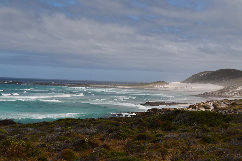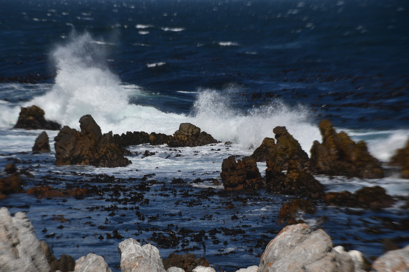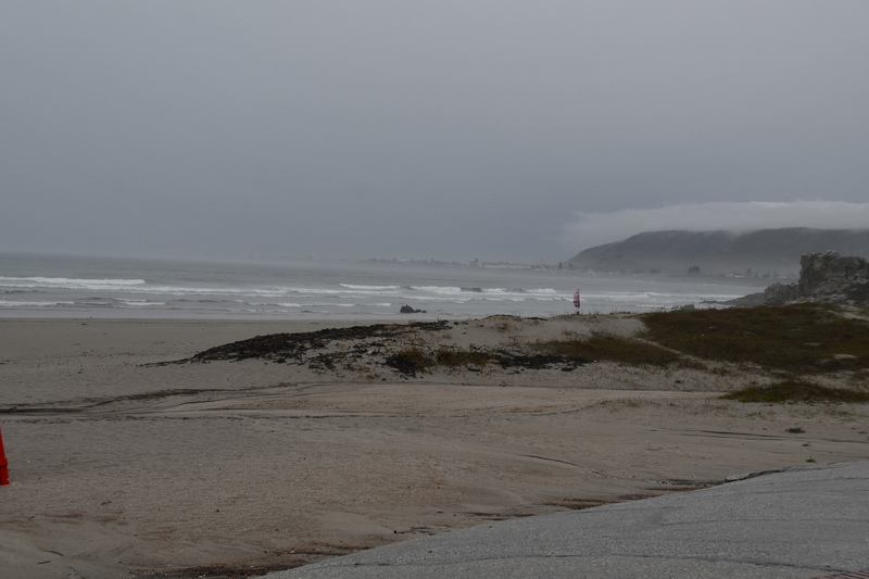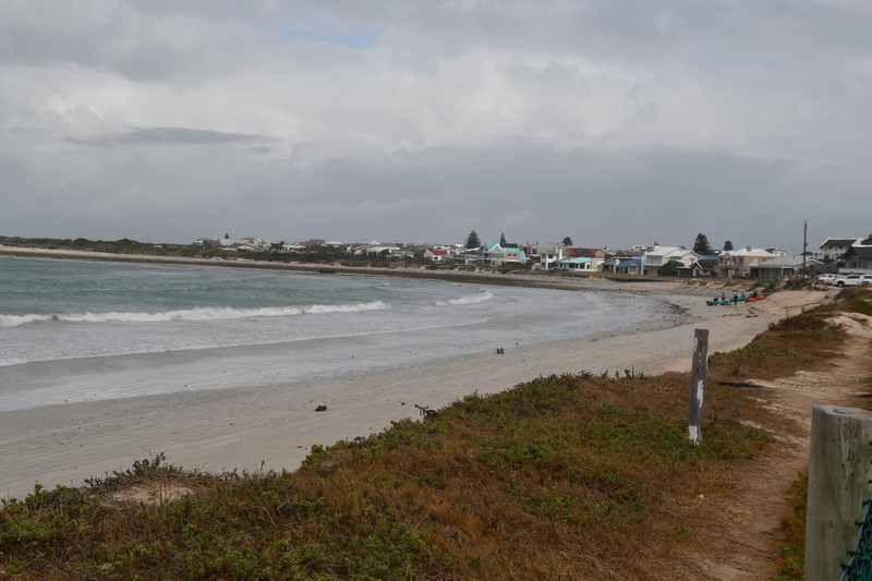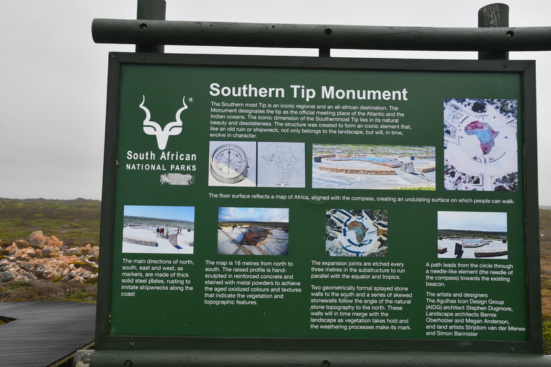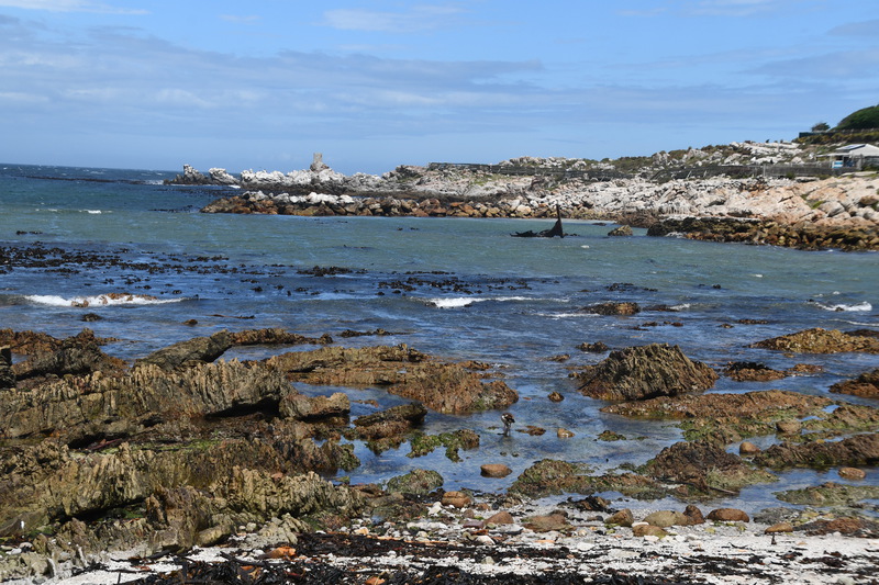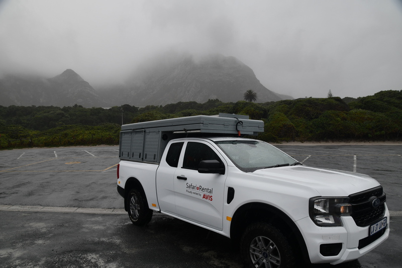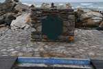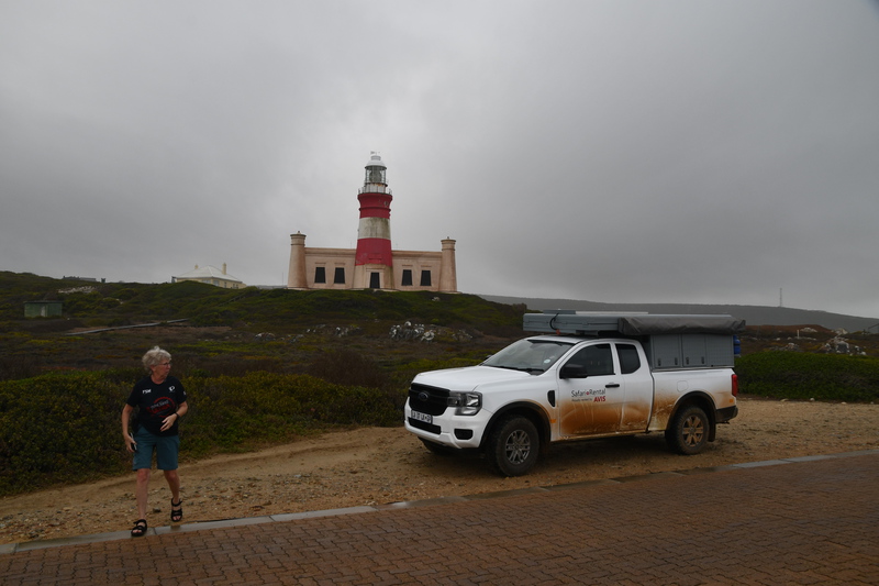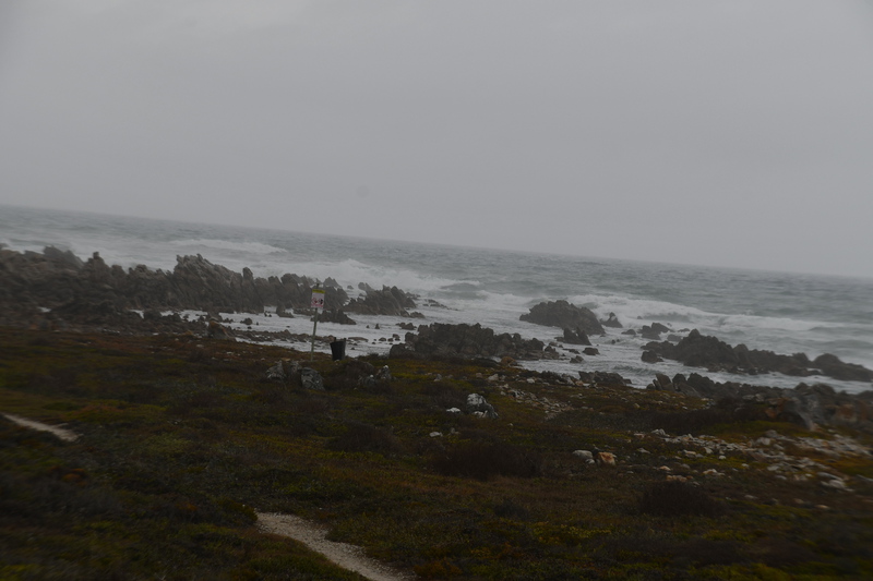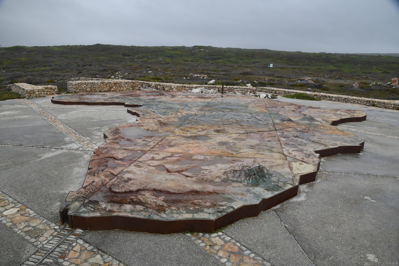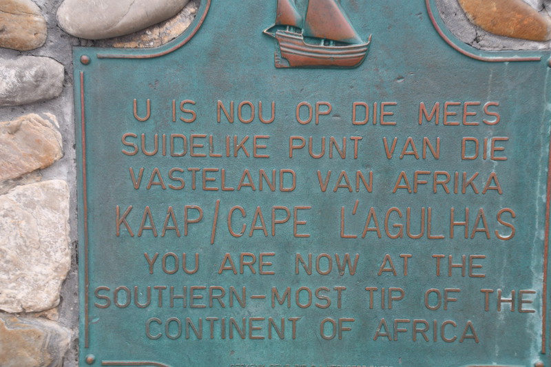 Die ganze Nacht zogen heftige Gewitterfronten mit Starkregen über uns hinweg. Als wir aufstehen bemerken wir, dass unsere T-Shirts und meine Hose, die auf einer unteren Ablage die Nacht verbracht haben, glitschnass sind. Ich ziehe mein nasses Shirt ans, Mario geht oben ohne, zum Toilettenhaus – und obwohl wir uns beeilen sind wir noch nasser geworden. Das gleiche gilt für die Meter Rückweg. Kaffeekochen und Frühstücken fällt wegen Regen und Wind aus. Wir packen zusammen und verlassen unseren Platz um im Dorf an einem Supermarkt anzuhalten – im Supermarkt steht das Wasser, trotzdem ist er geöffnet und wir kaufen ein Hotdog für Mario und ein Applepie für mich. Außerhalb des Marktes gibt es ein Coffee-to-go. Ich setze mich mit unserem Frühstück ins Auto, Mario kauft uns einen Cappuccino und wir frühstücken im Fahrerhaus auf dem Parkplatz des Supermarktes. Wir fahren auf der Küstenstraße, die mehrfach überspült ist. Von den Seitenwegen und Straßen wird Sand und Wasser auf die Hauptstraße gespült. Über Hermanus und Stanford fahren wir nach Gansbaai. Dort beschließen wir, die Küstenstraße zu verlassen um über Baardskeerdersbos nach Struisbaai zu fahren. Auf dieser Strecke lässt der Regen nach, ja er hört sogar auf. Die geteerte Straße endet plötzlich und wir fahren auf einer untergeordneten Straße, d.h. Schotterstrecke. Wenige Kilometer vor Struisbaai kommen wir wieder auf eine Teerstraße und erreichen nach ca. einer Viertel Stunde das Ziel, ein Campingplatz in Struisbaai, fast unmittelbar am Meer. Bevor wir diesen jedoch anfahren, fahren wir noch einige Kilometer weiter zum Cape Agulhas – die ist der wirklich südlichste Festlandpunkt Südafrikas. Wir unternehmen für heute den ersten und einzigsten Spaziergang! Danach beziehen wir unseren Platz, wieder sind nur wenige Plätze belegt. Mario spritzt unser Auto ab – etwas Sauberkeit muss sein. Wir putzen den kleinen Innenraum und ich hänge die nassen Klamotten von heute Morgen auf.