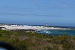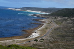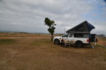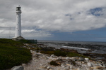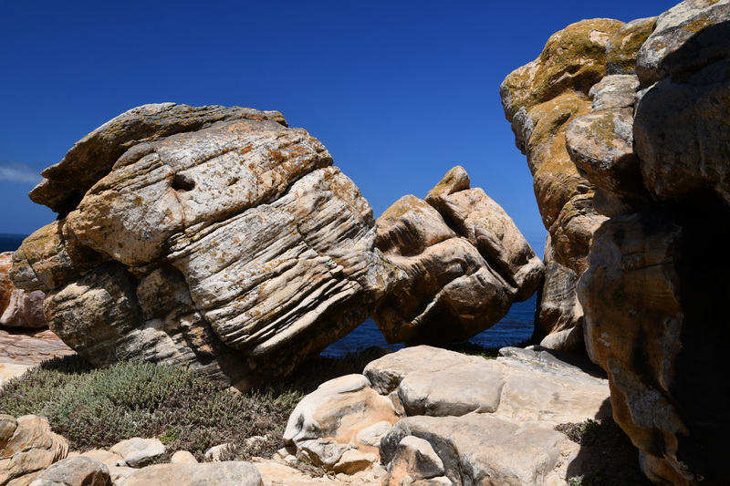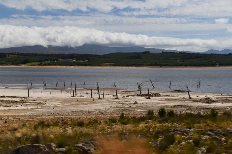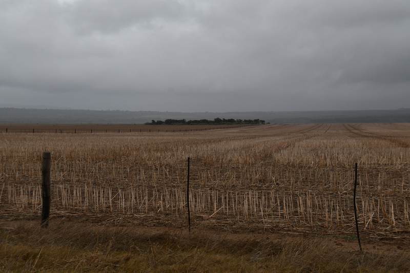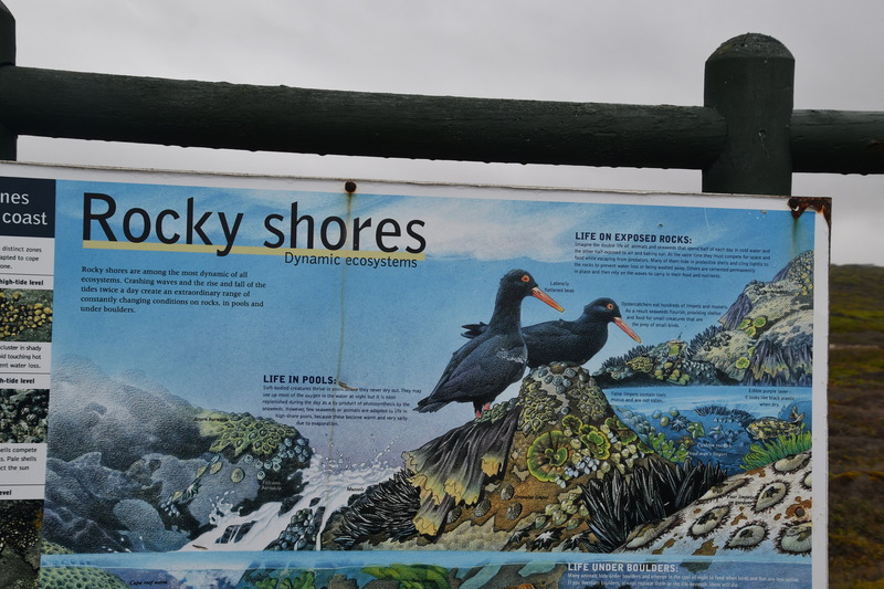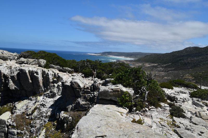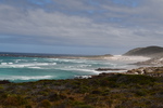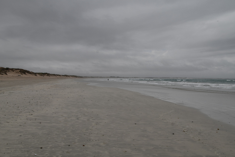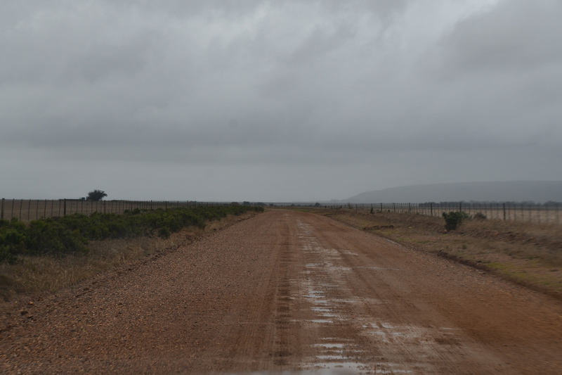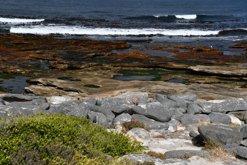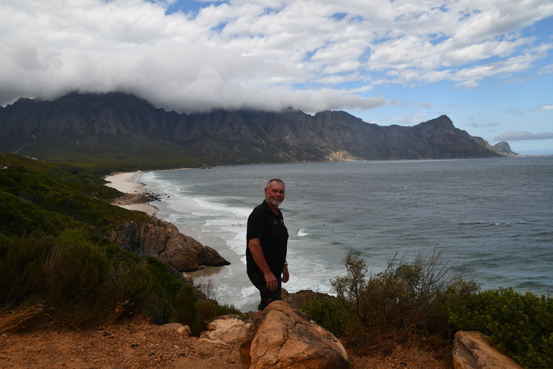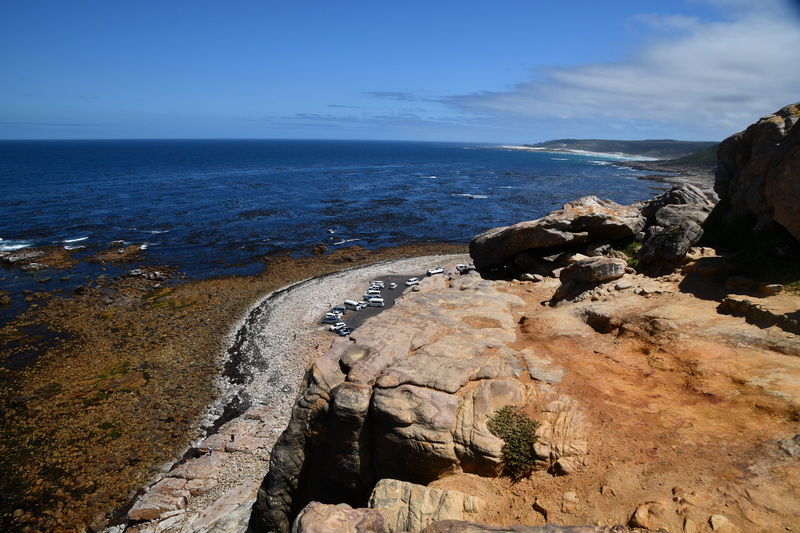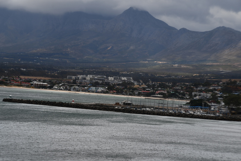 Die ganze Nacht zogen heftige Gewitterfronten mit Starkregen über uns hinweg. Als wir aufstehen bemerken wir, dass unsere T-Shirts und meine Hose, die auf einer unteren Ablage die Nacht verbracht haben, glitschnass sind. Ich ziehe mein nasses Shirt ans, Mario geht oben ohne, zum Toilettenhaus – und obwohl wir uns beeilen sind wir noch nasser geworden. Das gleiche gilt für die Meter Rückweg. Kaffeekochen und Frühstücken fällt wegen Regen und Wind aus. Wir packen zusammen und verlassen unseren Platz um im Dorf an einem Supermarkt anzuhalten – im Supermarkt steht das Wasser, trotzdem ist er geöffnet und wir kaufen ein Hotdog für Mario und ein Applepie für mich. Außerhalb des Marktes gibt es ein Coffee-to-go. Ich setze mich mit unserem Frühstück ins Auto, Mario kauft uns einen Cappuccino und wir frühstücken im Fahrerhaus auf dem Parkplatz des Supermarktes. Wir fahren auf der Küstenstraße, die mehrfach überspült ist. Von den Seitenwegen und Straßen wird Sand und Wasser auf die Hauptstraße gespült. Über Hermanus und Stanford fahren wir nach Gansbaai. Dort beschließen wir, die Küstenstraße zu verlassen um über Baardskeerdersbos nach Struisbaai zu fahren. Auf dieser Strecke lässt der Regen nach, ja er hört sogar auf. Die geteerte Straße endet plötzlich und wir fahren auf einer untergeordneten Straße, d.h. Schotterstrecke. Wenige Kilometer vor Struisbaai kommen wir wieder auf eine Teerstraße und erreichen nach ca. einer Viertel Stunde das Ziel, ein Campingplatz in Struisbaai, fast unmittelbar am Meer. Bevor wir diesen jedoch anfahren, fahren wir noch einige Kilometer weiter zum Cape Agulhas – die ist der wirklich südlichste Festlandpunkt Südafrikas. Wir unternehmen für heute den ersten und einzigsten Spaziergang! Danach beziehen wir unseren Platz, wieder sind nur wenige Plätze belegt. Mario spritzt unser Auto ab – etwas Sauberkeit muss sein. Wir putzen den kleinen Innenraum und ich hänge die nassen Klamotten von heute Morgen auf.
