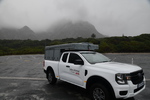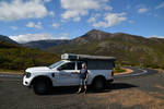 Ich muss mich verbessern!!! Es regnet nicht es schüttet und stürmt an unserem Platz. Um 18.30 Uhr beschließt Mario, den Stellplatz zu wechseln. Wir fahren mit aufgestelltem Zeltdach zwei Reihen nach hinten – hier bläst der Wind nicht ganz so. Ein Gewitter setzt ein und wir sitzen – liegen in unserem Auto – es ist 19 Uhr und fast dunkel. Wir haben so gutes Licht in unserem Bettbereich, dass Mario mir eine Taschenlampe hält, damit ich diesen Reisetag schreiben kann.