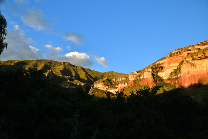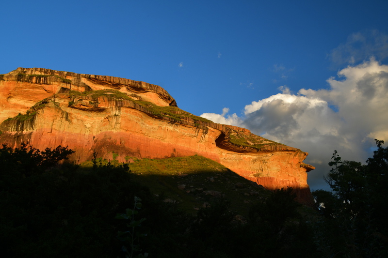 Wir frühstücken um 7.30 Uhr bei 15° und blauem Himmel. Als wir den Platz verlassen sehen wir Zebras und Antilopen auf dem Feld grasen – so kann sich der Morgen doch sehen lassen. Heute planen wir nur eine kurze Strecke und zwar zum „Golden Gate Nationalpark“, am Rande der Drakensberge. Auf dem Weg dorthin möchten wir noch einkaufen im ersten Ort, in dem wir halten gibt es zwar Geschäfte, aber nicht das was wir brauchen und so machen wir im Touristenstädtchen Clarens halt. Dies ist ein wirklich herausgeputztes Städtchen und wir beschließen einen Bummel zu machen. Wir stellen unser Auto am Wegesrand ab und lassen es für 120 Rand (6,- Euro) von Hand waschen. Während unser Auto gereinigt wird machen wir einen Bummel, trinken Kaffee – lassen es uns einfach gut gehen. Als wir zurück sind ist die Reinigung des Wagens abgeschlossen (so sauber war er seid der Übernahme in Kapstadt nicht mehr). Nun haben wir noch ca. 30 km bis zum Nationalpark vor uns. Nach gefühlt jedem gefahrenen Meter machen wir einen Fotostopp – die Eindrücke sind gigantisch und werden trotzdem immer noch einen ticken besser. Im Nationalparkbüro angekommen fragen wir nach einem Platz für die Nacht und die beiden Damen an der Rezeption erklären uns, es gibt keinen Platz, sie sind ausgebucht, es kommt eine größere Reisegruppe! Wir schauen uns an und fragen nach einer Alternative für uns, da schauen sich die beiden Damen an und lachen – selbstverständlich gibt es noch Platz für uns. Wir stellen unser Auto auf, ziehen Wanderschuhe an und packen Wasser in den Rucksack und laufen los. Wir gehen zum „Mushroomrock“, eine kleine Wanderung bzw. ein größerer Spaziergang. Es ist einfach nur schön, nach ca. 1 ½ Stunden sind wir wieder zurück und genießen den späten Nachmittag. Wir machen so viele Fotos von dieser Felsformation – dass sie sich kein Mensch je anschauen wird. Wir sitzen neben unserem Auto und lichten den Fels in allen möglichen Spätnachmittags- und Abendlichtern ab. Tatsächlich gehen mir für diesen Ort die Superlative aus.