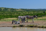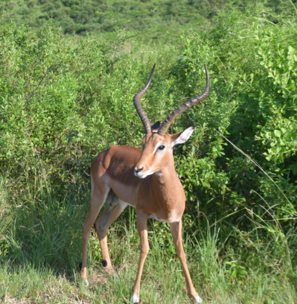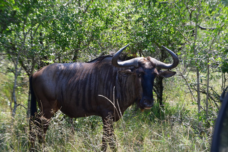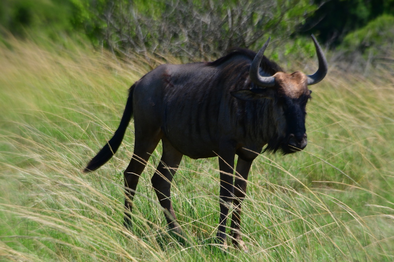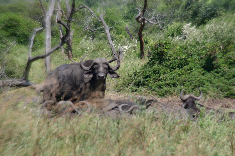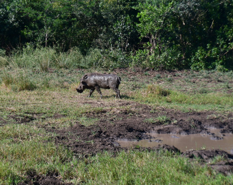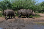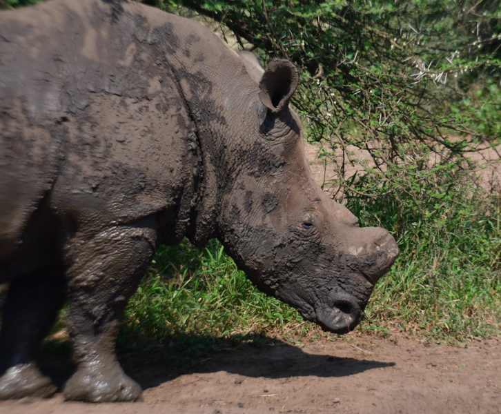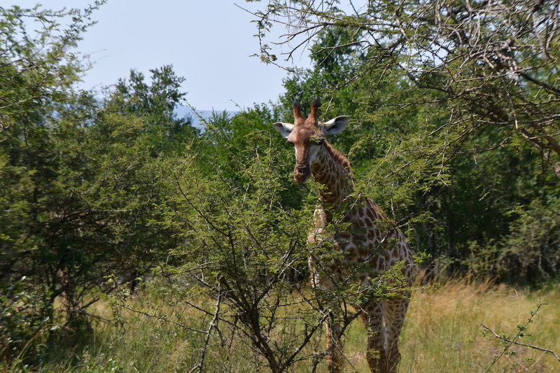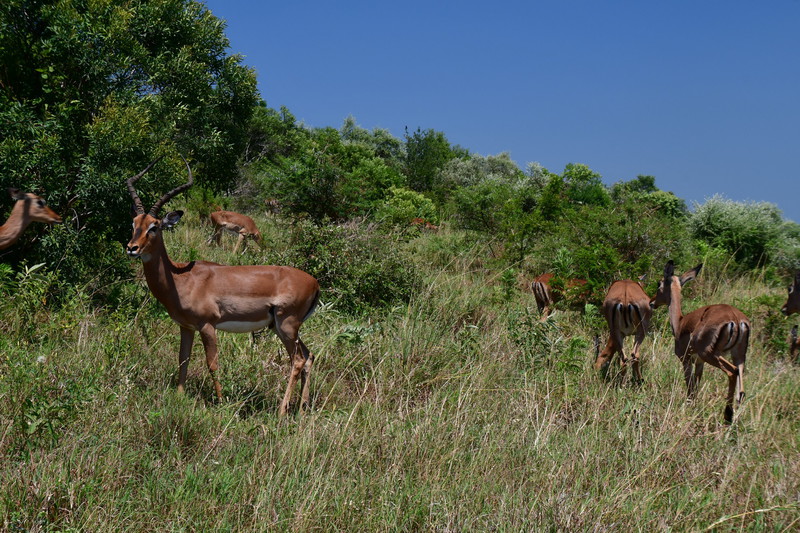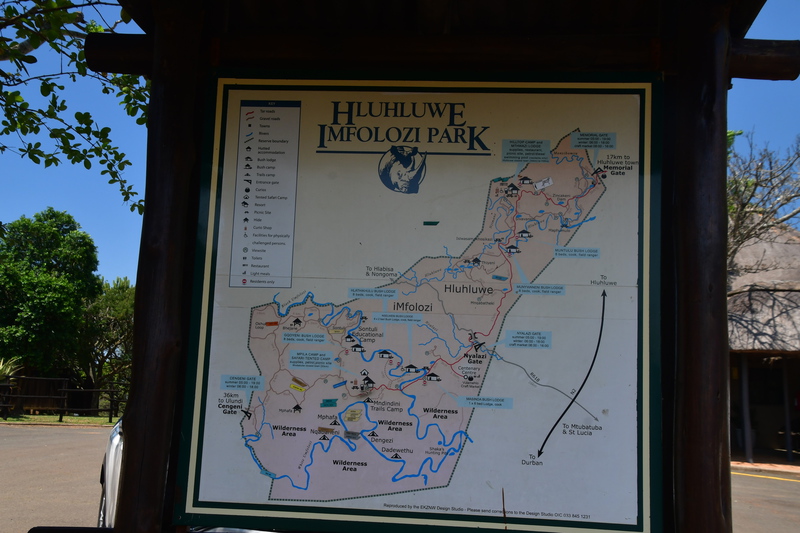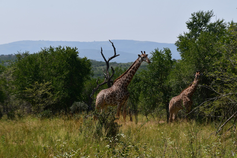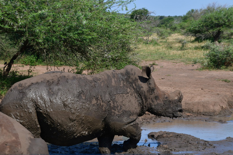 Wir stehen früh auf, denn wir wollen den Tag im Hluhluwe Nationalpark (er ist der älteste Wildpark Südafrikas und hat eine Größe von 960 Quadratkilometer) zu verbringen. Wir erreichen den Park bereits vor 8 Uhr und beginnen unsere persönliche Safari. Wir treffen auf die von uns schon oft gesehenen Kudus, Springböcke, Warzenschweine und Büffel. Vergeblich halten wir Ausschau nach Löwen und Elefanten. Plötzlich tritt Mario auf die Bremse, er hat eine Gruppe Giraffen gesehen. Wir rollen zurück um diese Tiere eine Weile zu beobachten. Dann geht es weiter, wir sind noch auf der Suche nach den Breitmaulnashörnern, von denen es 2.500 im Park geben soll. Wir haben die Hoffnung fast schon aufgegeben, als wir in einem kleinen Wasserloch doch noch 2 dieser schwergewichtigen Tiere erblicken. Wir beobachten, wie sie aus dem Wasserloch steigen, eine kleine Weile daneben stehen um dann gemächlich davon zu traben. Als wir am Ausgangstor des Parks ankommen, haben wir alleine im Park 140 km davon das meiste auf Schotter zurückgelegt. Wir verlassen den Park über ein anderes Tor, als wir eingefahren sind, und können kaum glauben, dass wir einen Rückweg von 180 km haben, was bedeutet, dass wir erst gegen 18 Uhr zurück sein werden. Hätten wir dieses erwartet, dann hätten wir morgens alles eingepackt und hätten einen anderen Platz für die Nacht ausgesucht.