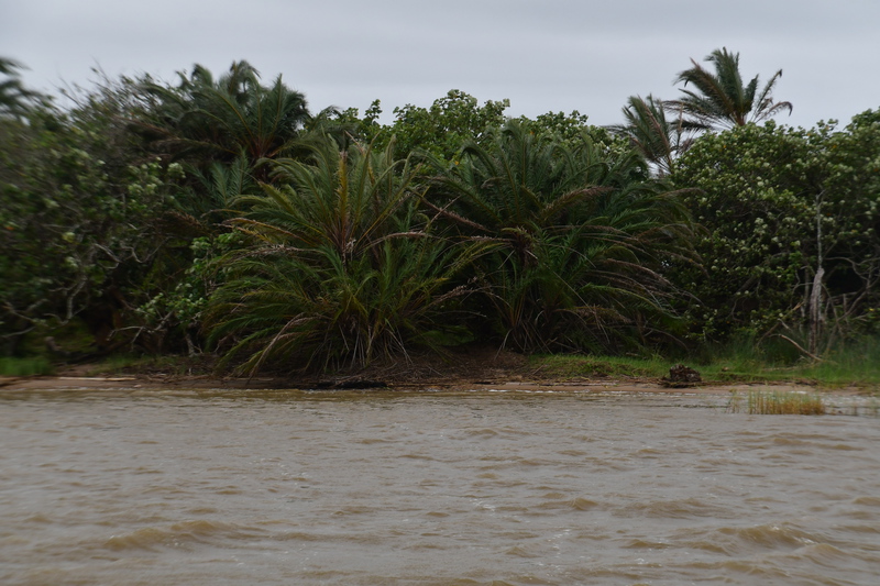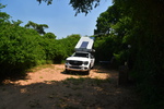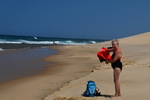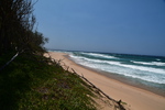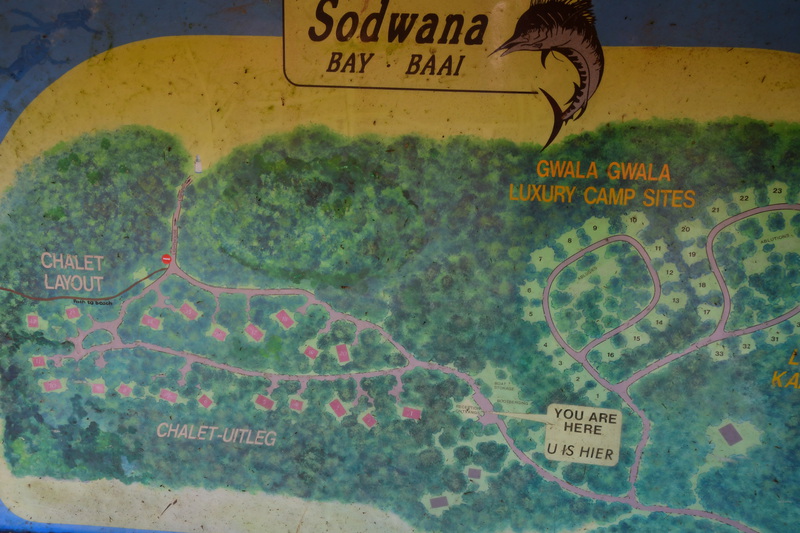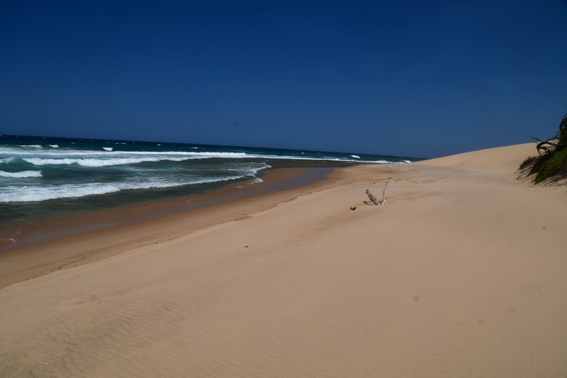 Mario möchte heute keine Strecke machen und so haben wir uns als Ziel das 120 km entfernte Sodwana Bay ausgesucht. Sodwana Bay ist, durch die der Bucht vorgelagerten Riffs, ein Taucherhotspot. Zur Zeit aber auch hier nicht viel los. Wir kommen zur Einfahrt an die Bay, hier müssen wir ein Tagesticket lösen und falls wir über Nacht bleiben, noch ein Übernachtungsticket. Wir bemerken am Kontrollpunkt, dass hier alles extra kostet: das Tauchen, das Fischen und auch das Schnorcheln muss bezahlt werden. Wir bezahlen die Übernachtungsgebühr für den Campingplatz, fahren zurück zur Eingangskontrolle und bezahlen dort den Aufenthalt, der über den Tag hinausgeht. Als dies erledigt ist beziehen wir einen x-beliebigen Platz – wir sind ganz alleine. Als unser Auto steht und das Zelt aufgebaut ist, packen wir unsere Badesachen und machen uns auf den Weg zum Strand. Wir hören das Meer rauschen, finden den Fußpfad erst beim 2. Rundgang durch die Chaletanlage. Als wir unser Ziel erreicht haben liegt ein vermeintlich grenzenloser Strand vor uns. Wir kühlen uns im Indischen Ozean ab – schwimmen ist hier nicht ratsam – und bummeln anschließend am Strand entlang, danach machen wir uns auf den schweißtreibenden Rückweg (über 40°). Als wir beim Abendessen sitzen hören wir plötzlich Stimmen, Parkwächter gehen den Platz ab, sie grüßen freundlich. Kurios auf diesem Platz ist, dass die Mülleimer keine Deckel haben – was uns wundert, denn es sind einige Affen unterwegs. Es beginnt zu regnen und zu gewittern und so ziehen wir uns recht früh in das Dachzelt zurück.